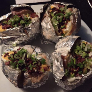 Deliciosa papa asada preparada con mantequilla, chorizo y queso derretido.