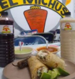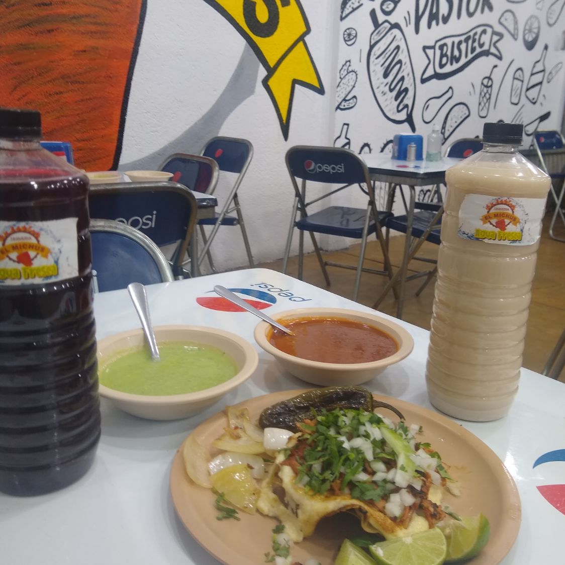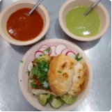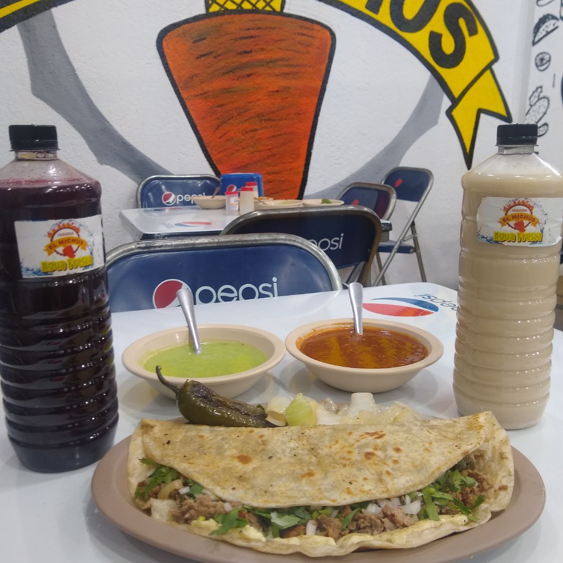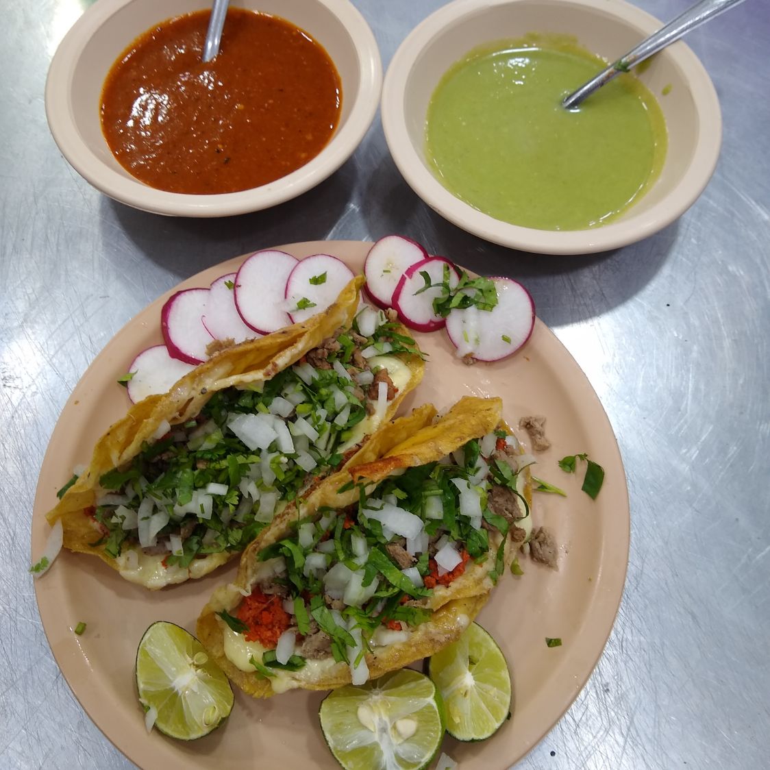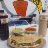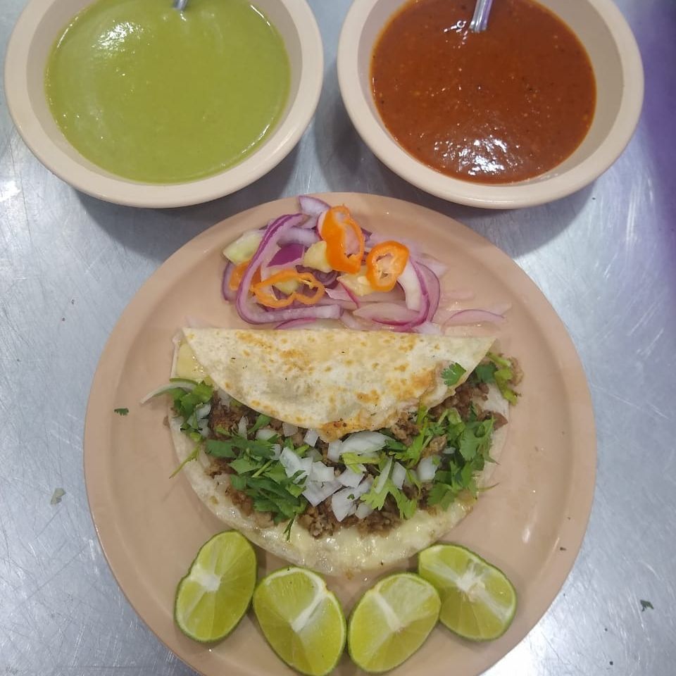 Acompañado de salsa roja guacamole ensalada verdura aparte y cebollas asadas