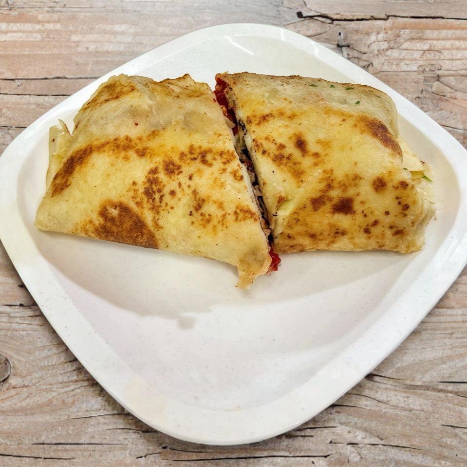 Pan de trigo, queso, chorizo, cebolla y cilantro