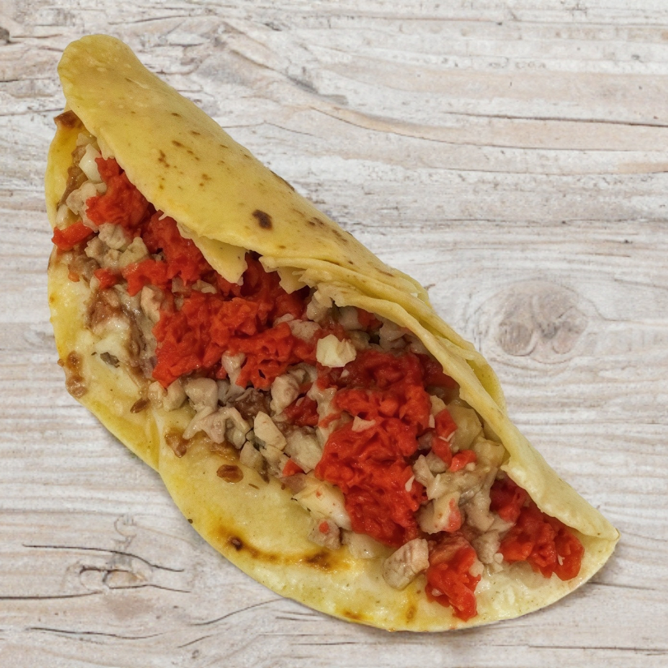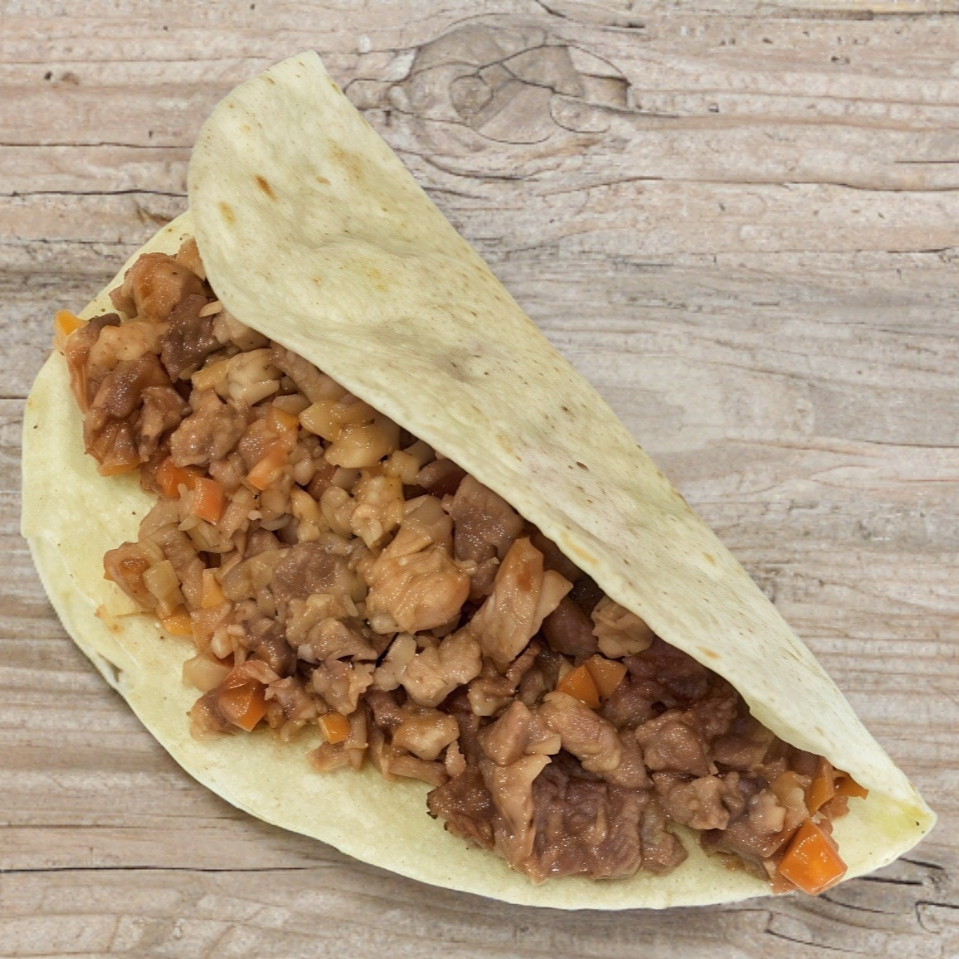 Tortilla de harina, queso, bistec, chorizo, pastor, frijoles, cebolla y cilantro