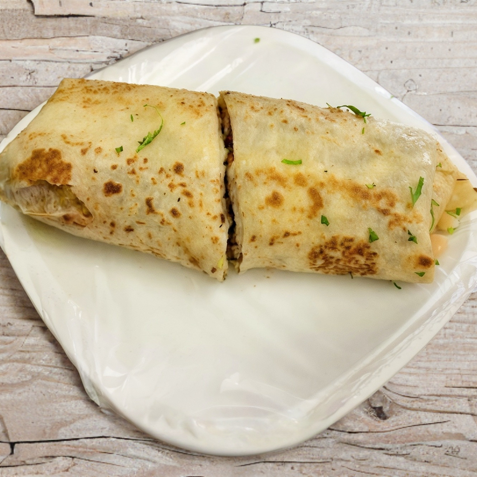 Tortilla de harina, queso, bistec de res, frijoles, cebolla y cilantro