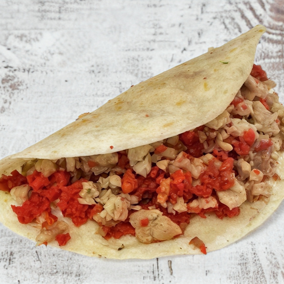 Tortilla de harina, queso, bistec, chorizo, cebolla y cilantro