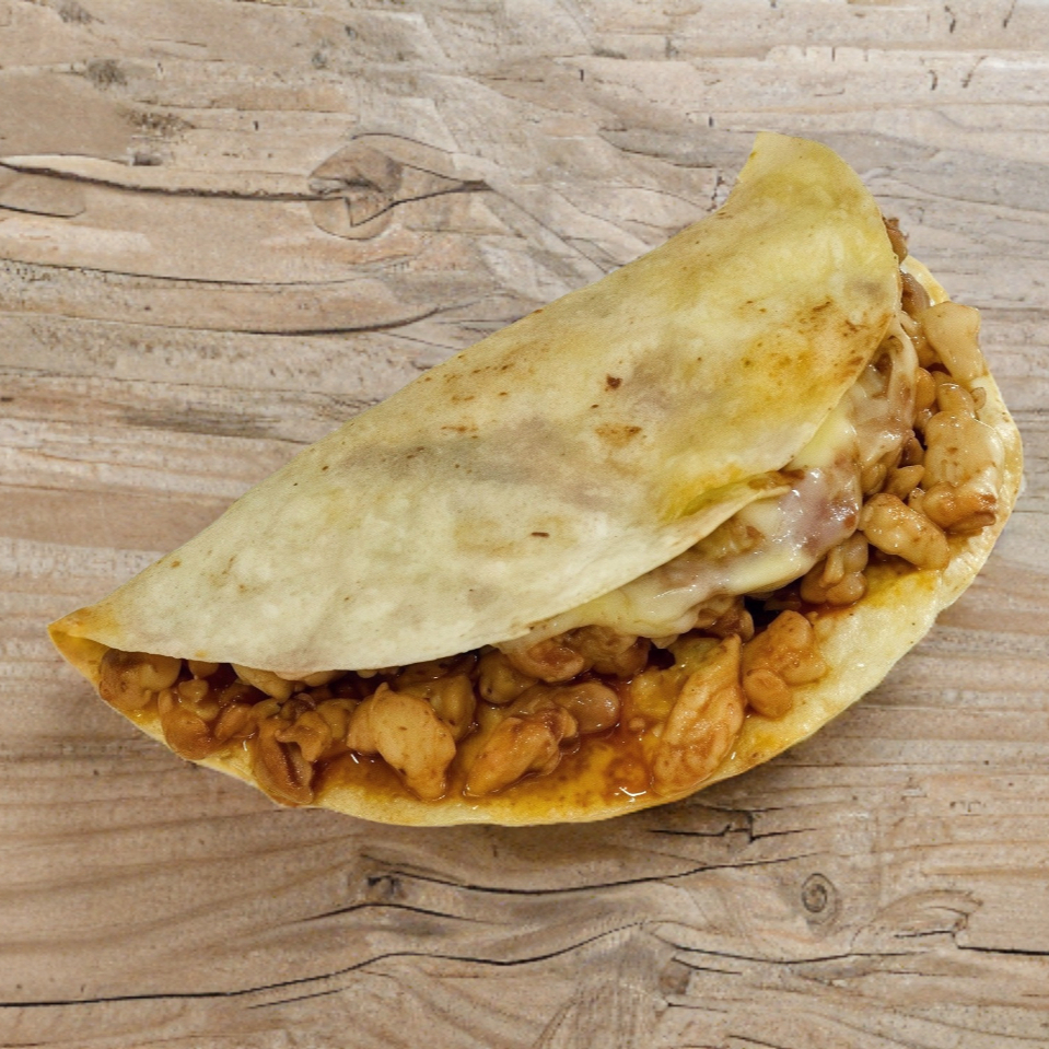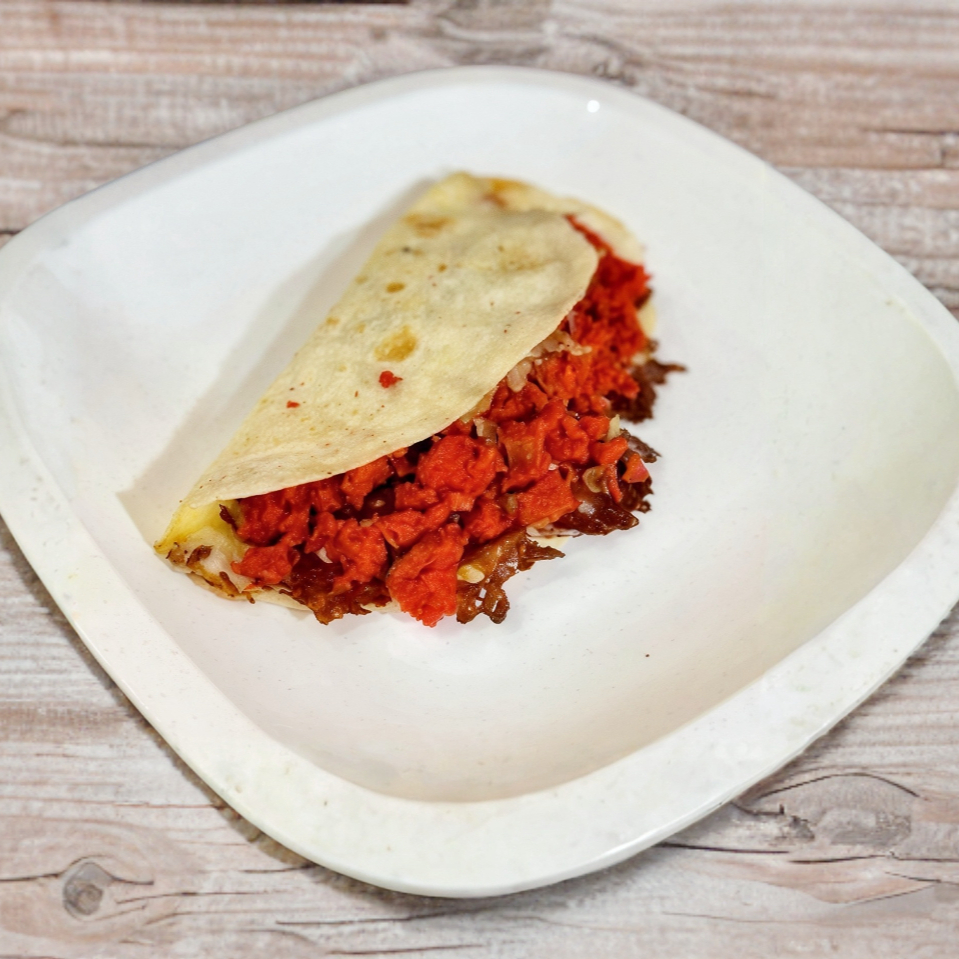 Tortilla de maíz, queso, chorizo, cebolla y cilantro