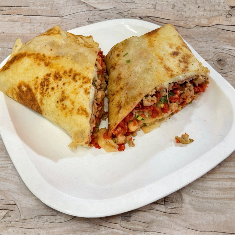 Tortilla de harina, queso, bistec y chorizo revueltos, frijoles, cebolla y cilantro
