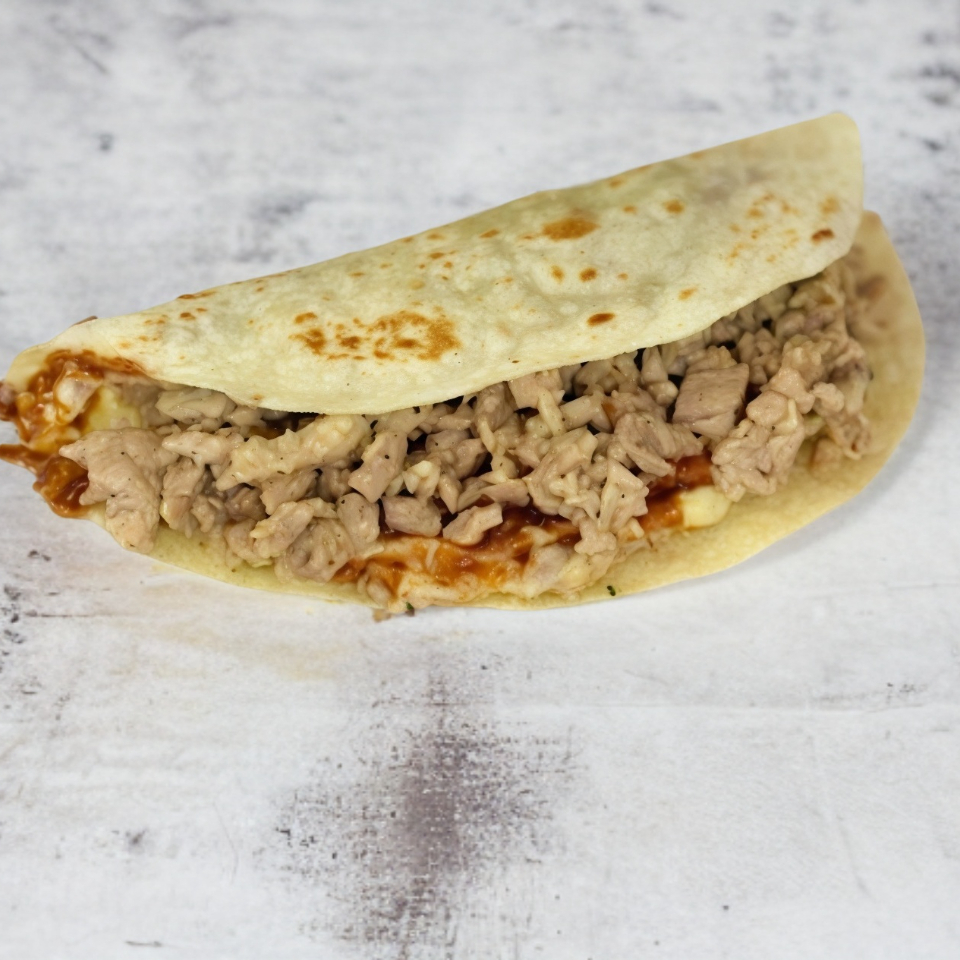 Tortilla de harina, queso, carne de cerdo adobada, frijoles, cebolla y cilantro