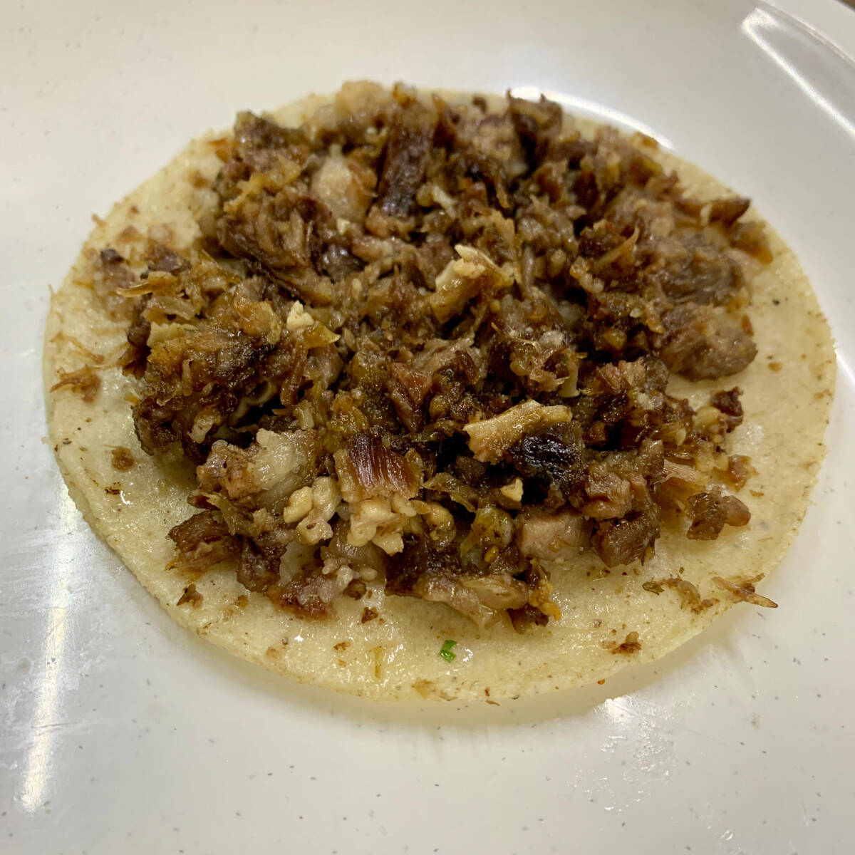 Tortilla de maíz, queso, bistec de cerdo adobado, cebolla y cilantro