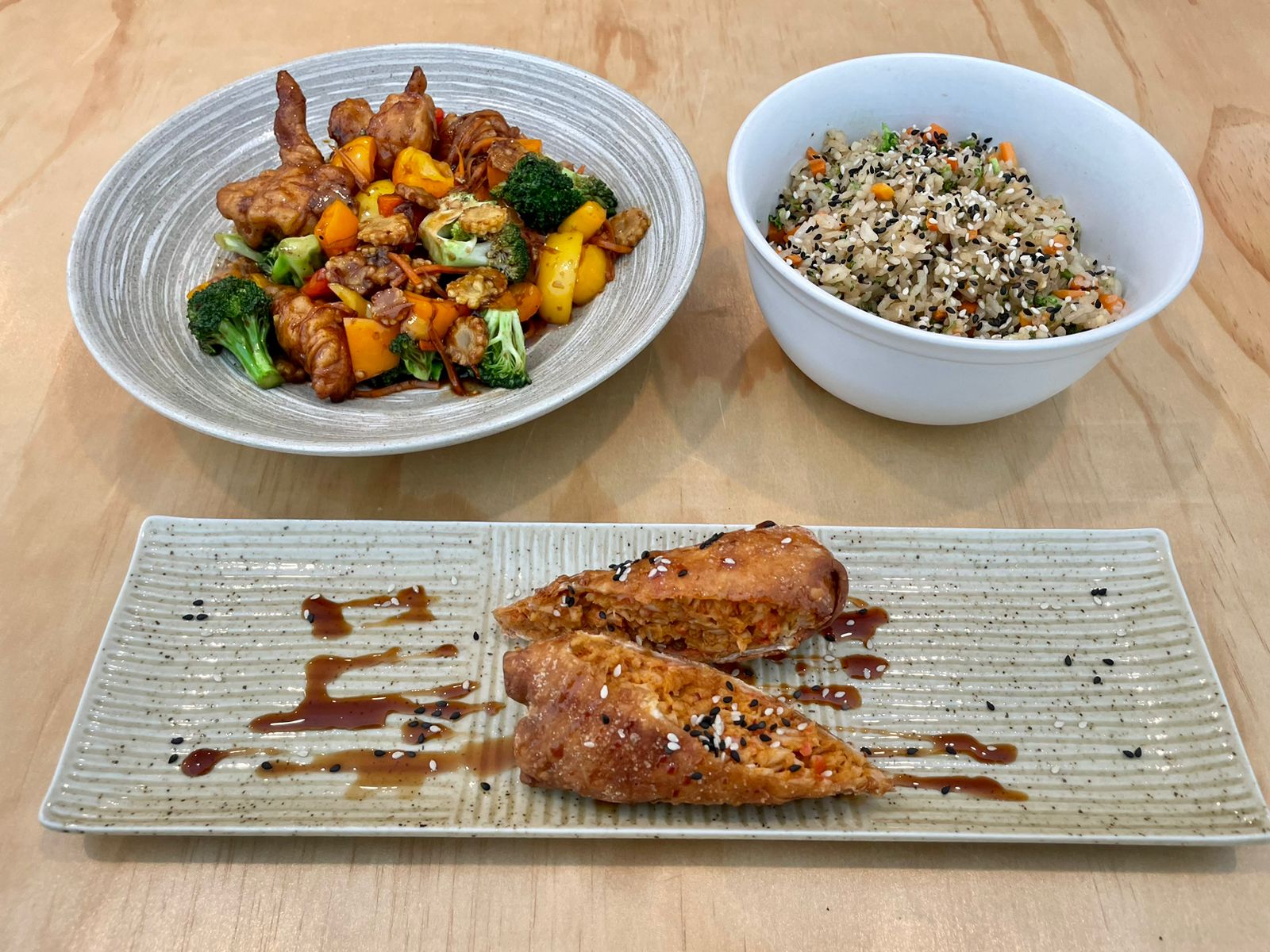 Rollito primavera de cangrejo, yakimeshi con verduras y pollo bangkok