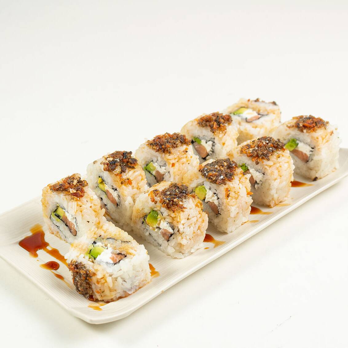 Salmón, queso philadelphia y aguacate, chicharrón de salmón y salsa de anguila