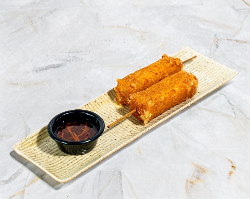 Rellenos con kanikama, pepino, aguacate, jitomate, mango, cilantro y ajonjolí. Envueltos en hoja de arroz, aderezados con salsa sweet chili