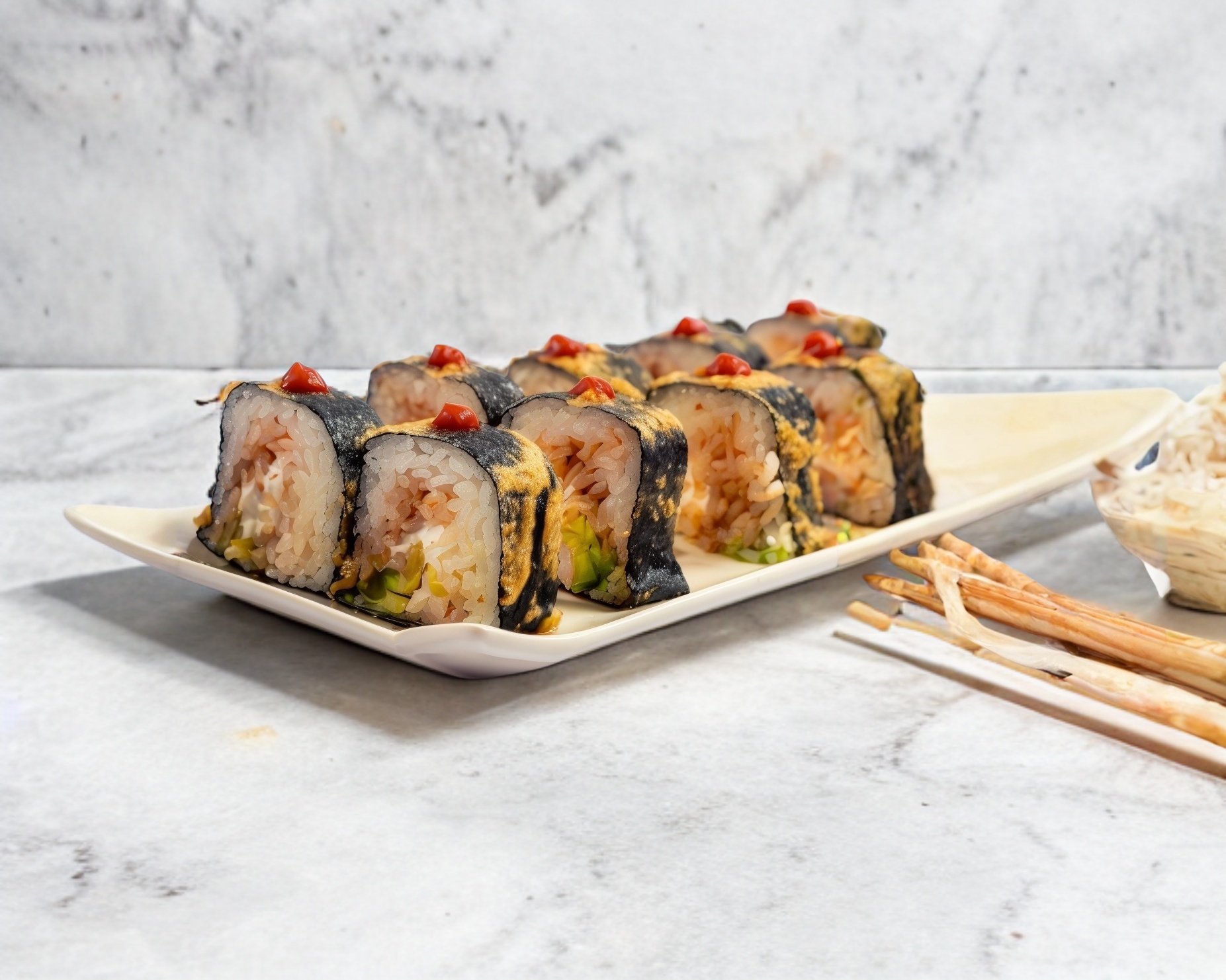 Camarón o res, kanikama, aguacate y queso philadelphia, aderezo de chipotle