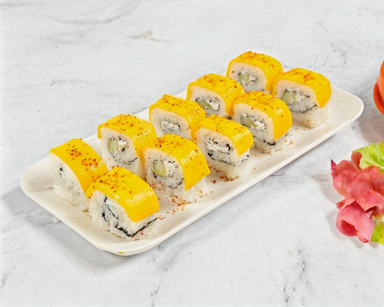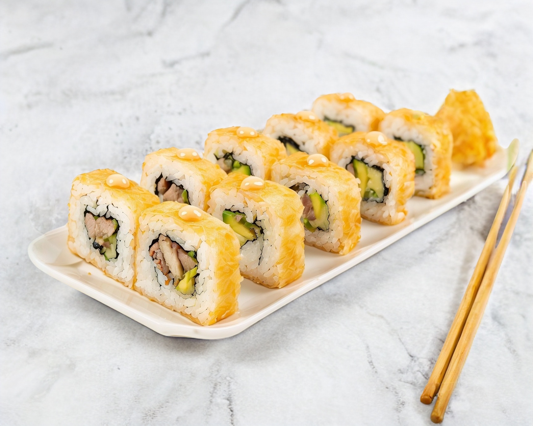 Camarón, surimi, pepino, aguacate y queso philadelphia, ajono