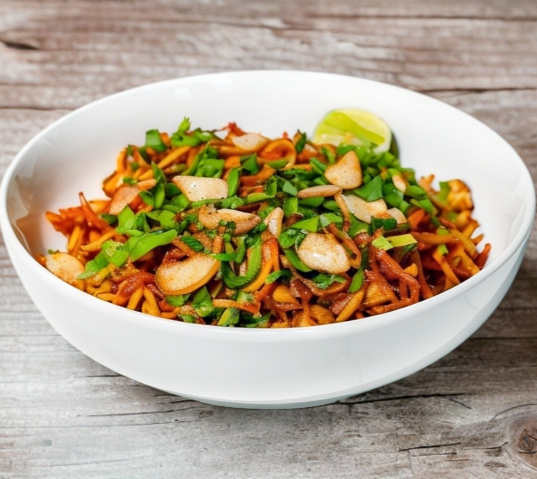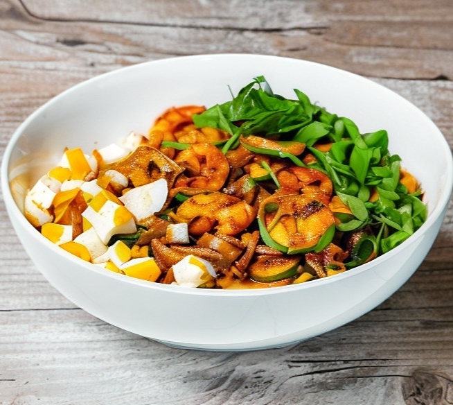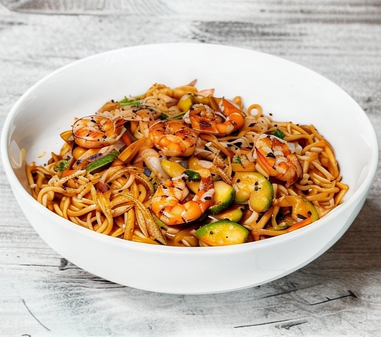 Camarón, udon, calabaza, germen y lechuga, salteados con una deliciosa pasta de Chile, con huevo como topping
