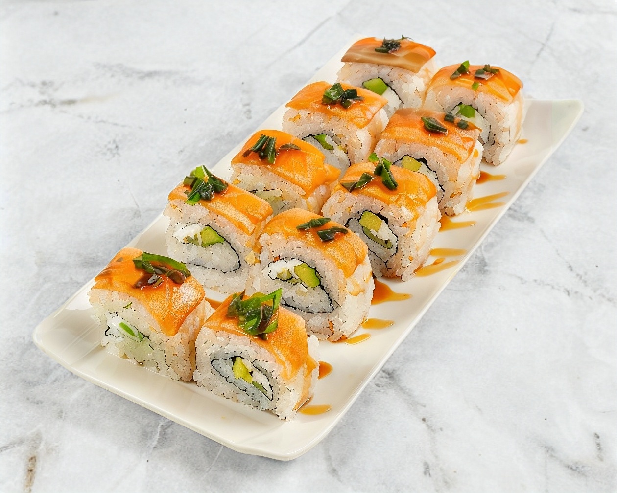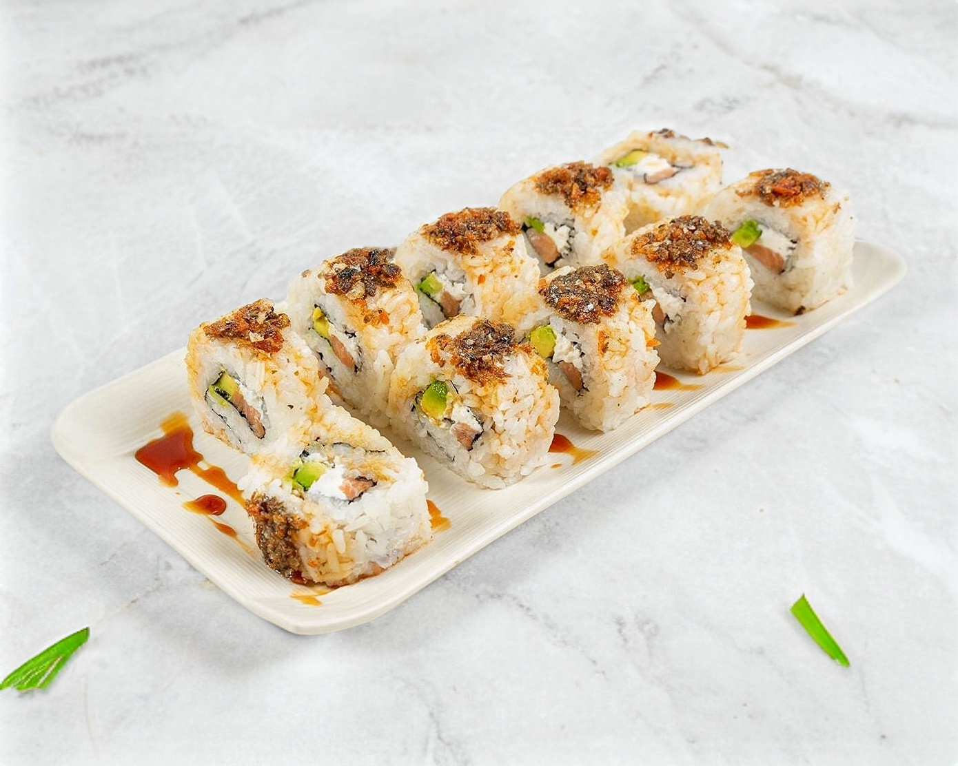 Salmón, queso philadelphia y aguacate, chicharrón de salmón y salsa de anguila