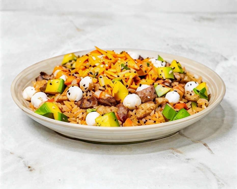 Arroz frito con brocoli, zanahoria, aguacate, pollo, res, queso philadelphia, ensalada de kanikama, salsa de anguila y un twist de ajonjolí