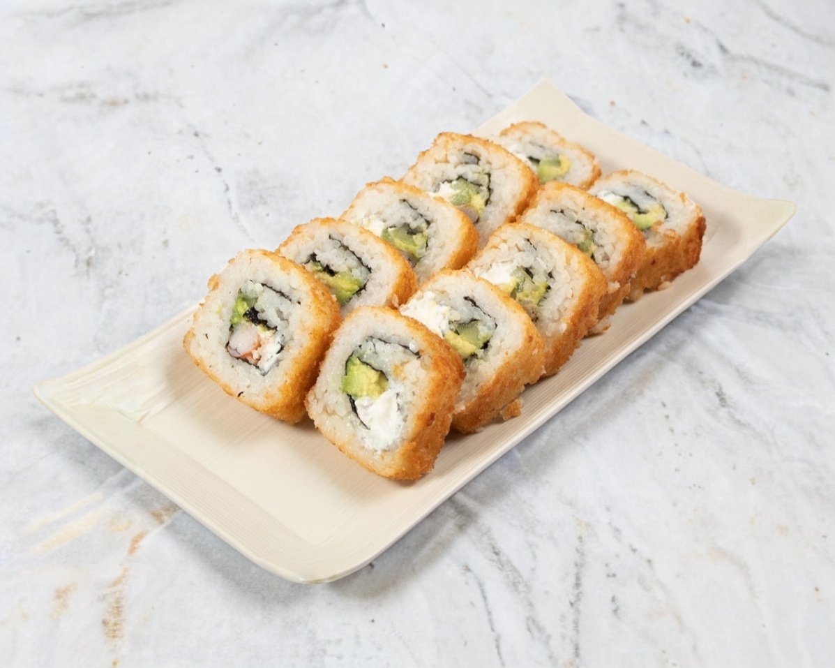 Aguacate, queso philadelphia y serrano, salmón y cilántro frito