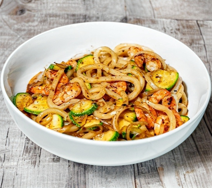 Camarón, udon, con calabaza y cebolla, salteados con una deliciosa combinación de aceite de sesame y mirin