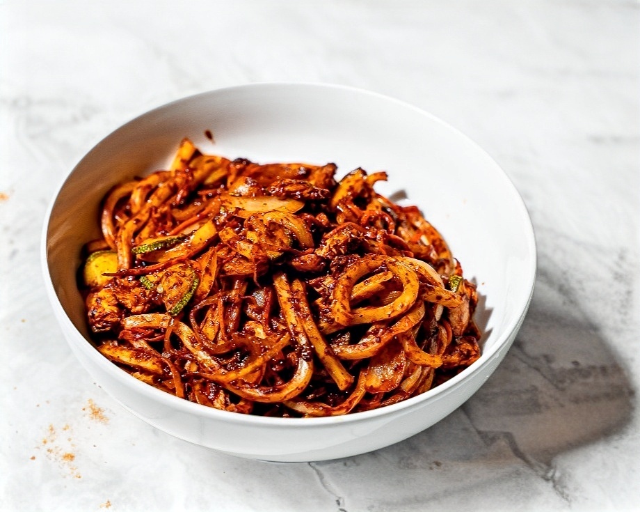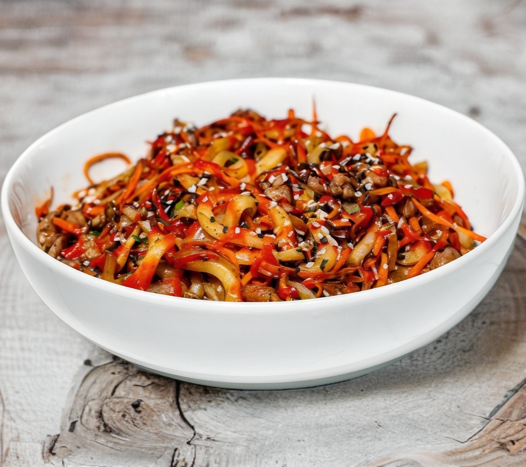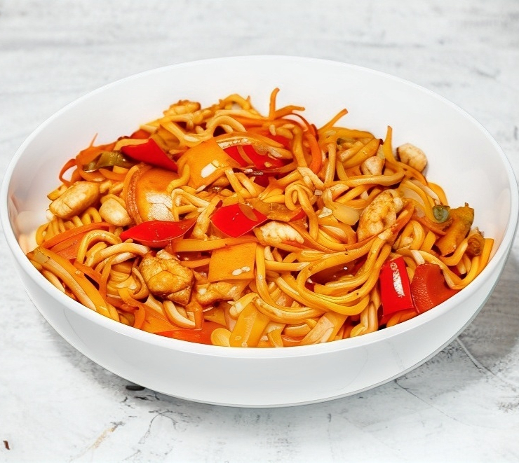 Pollo, udon, zanahoria, calabaza y cebolla