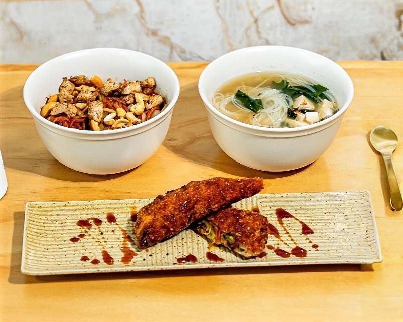 Rollito primavera de cangrejo, yakimeshi con verduras y pollo bangkok