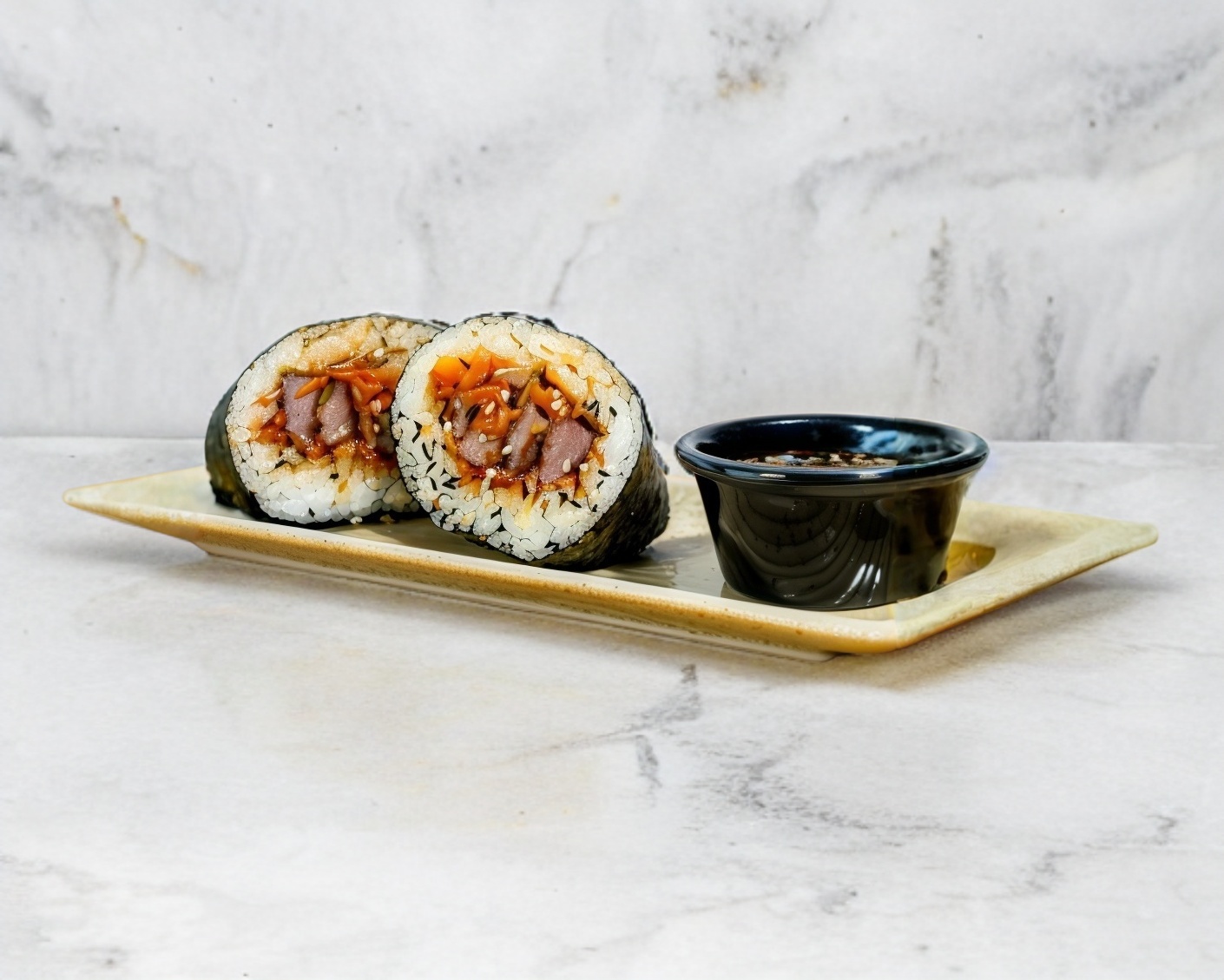 Arroz al vapor envuelto en alga nori, relleno con res, cebolla, zanahoria, aderezado con salsa dulce de jengibre y ajo