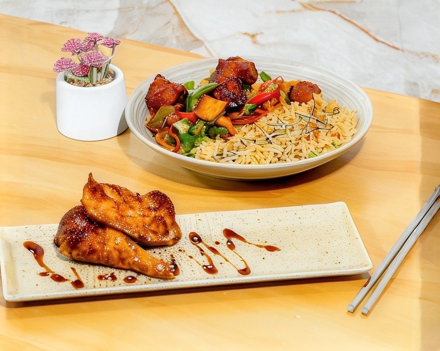 Trocitos de pechuga de pollo capeados, bañados con salsa de naranja, acompañados con una guarnición de arroz frito con verduras