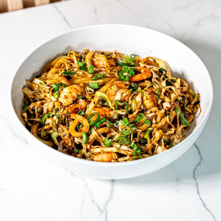 Camarón, udon, repollo y cebollín frescos, con hojuelas de chile seco como topping