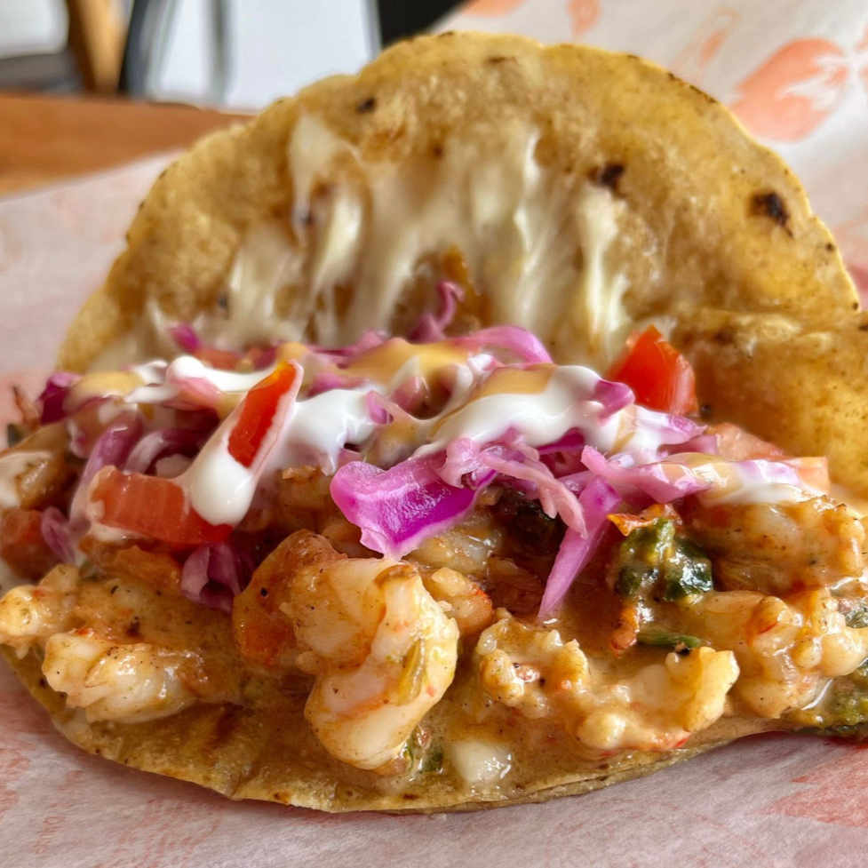 Camarones guisados en salsa picante servidos en una quesadilla de harina. Versión aumentada de nuestro popular Taco de Camarón Enchilado!