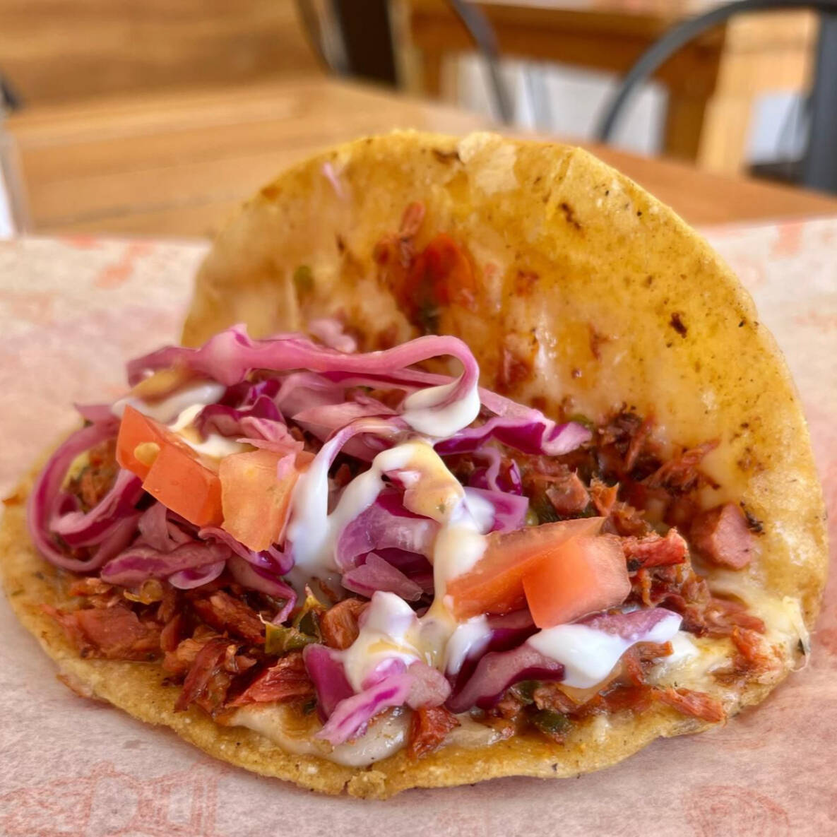 Camarones capeados crujinetes en tortilla de maíz con jitomate, cebolla, col morada y aderezos cremosos