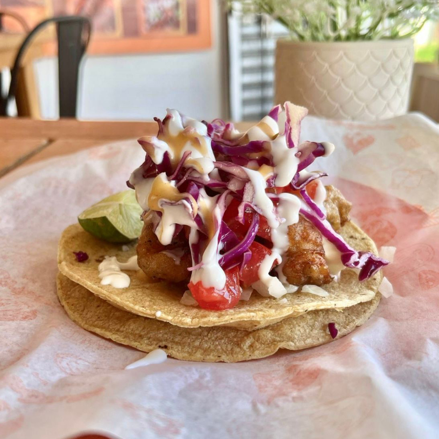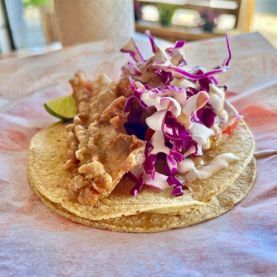 Pescado capeado crujiente montado en tortillas de maíz con cebolla, jitomate, col morada y aderezos cremosos