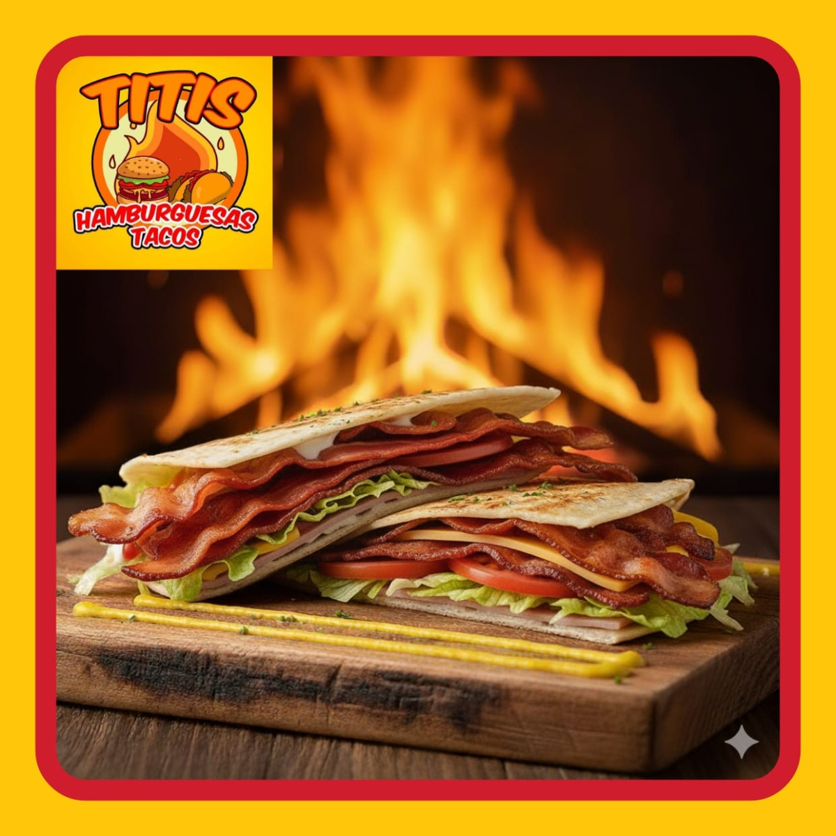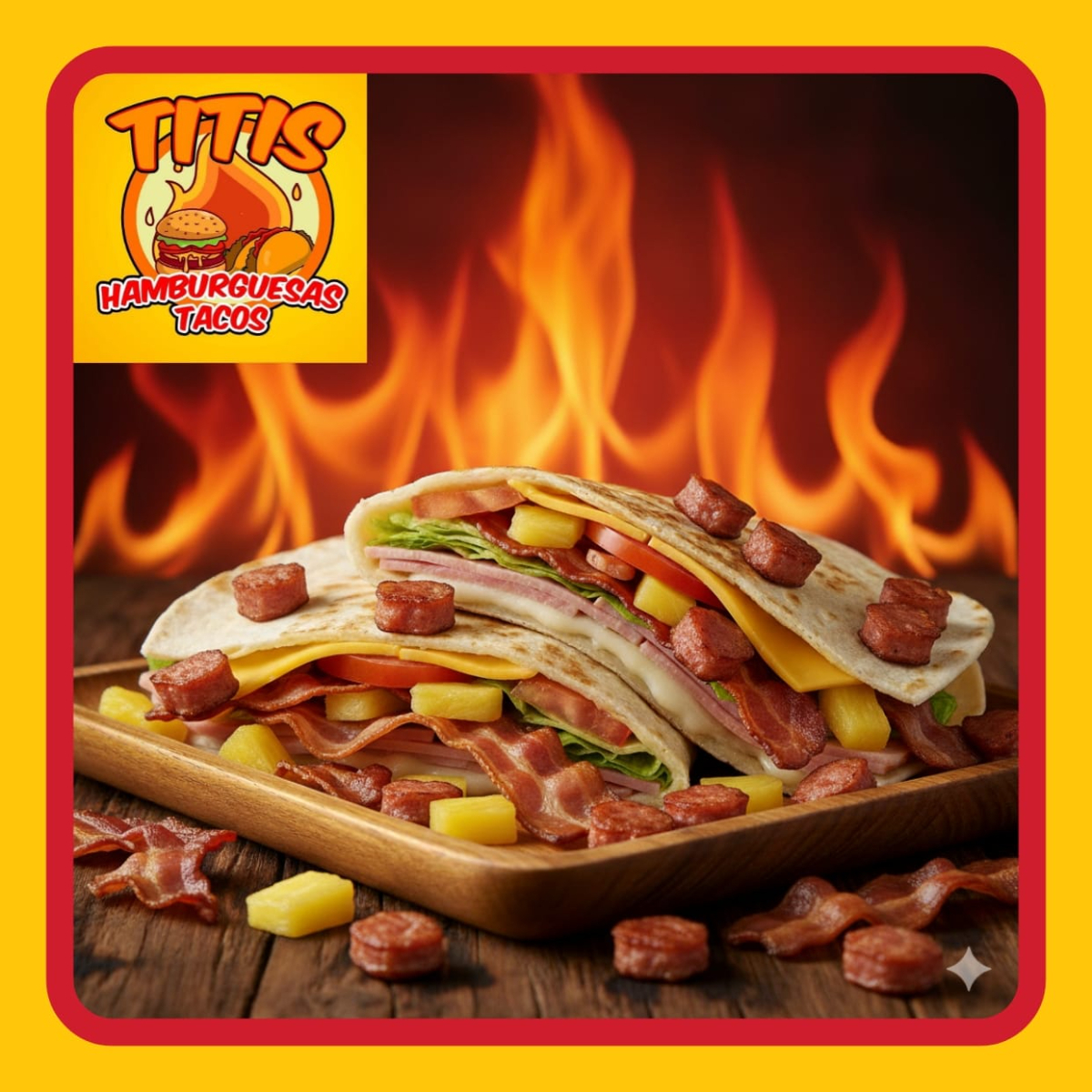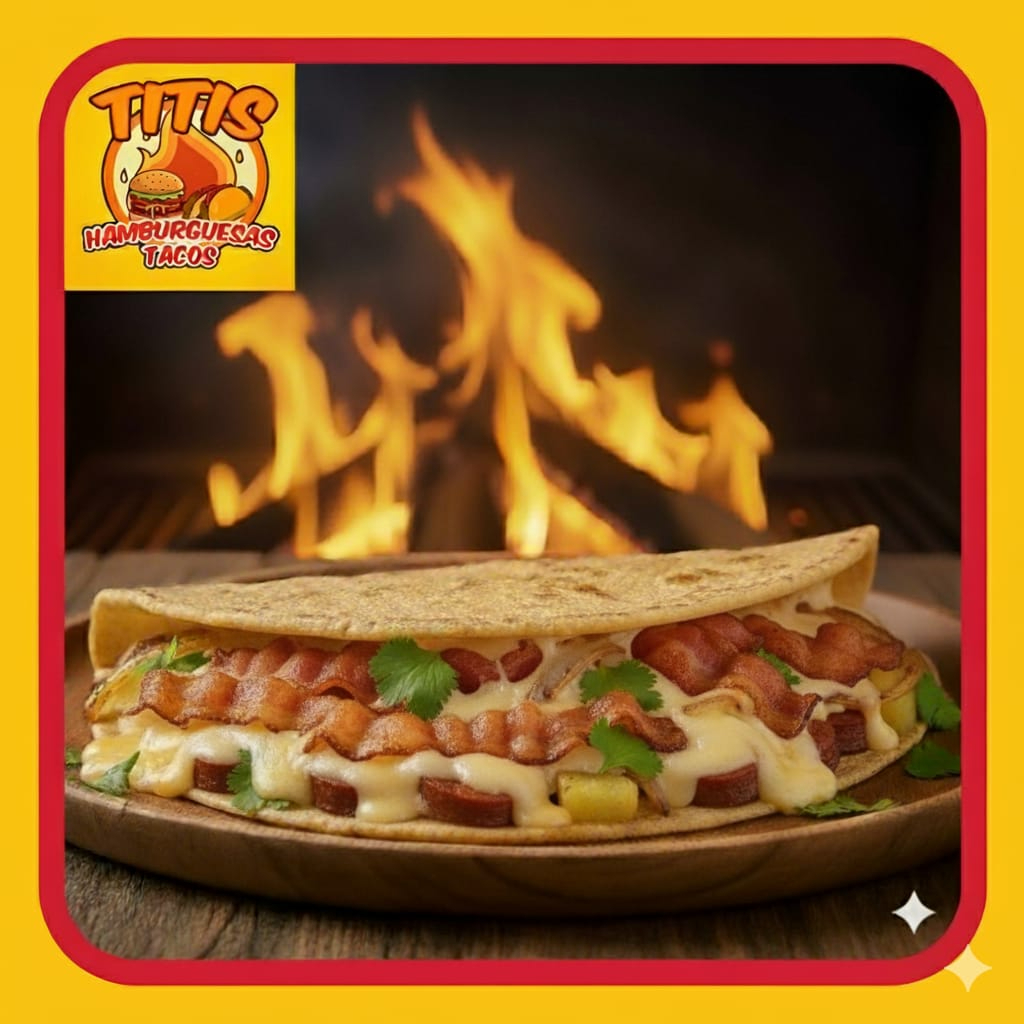 Doble tortilla de arina , jamon , queso amarillo , queso blanco y tocino
