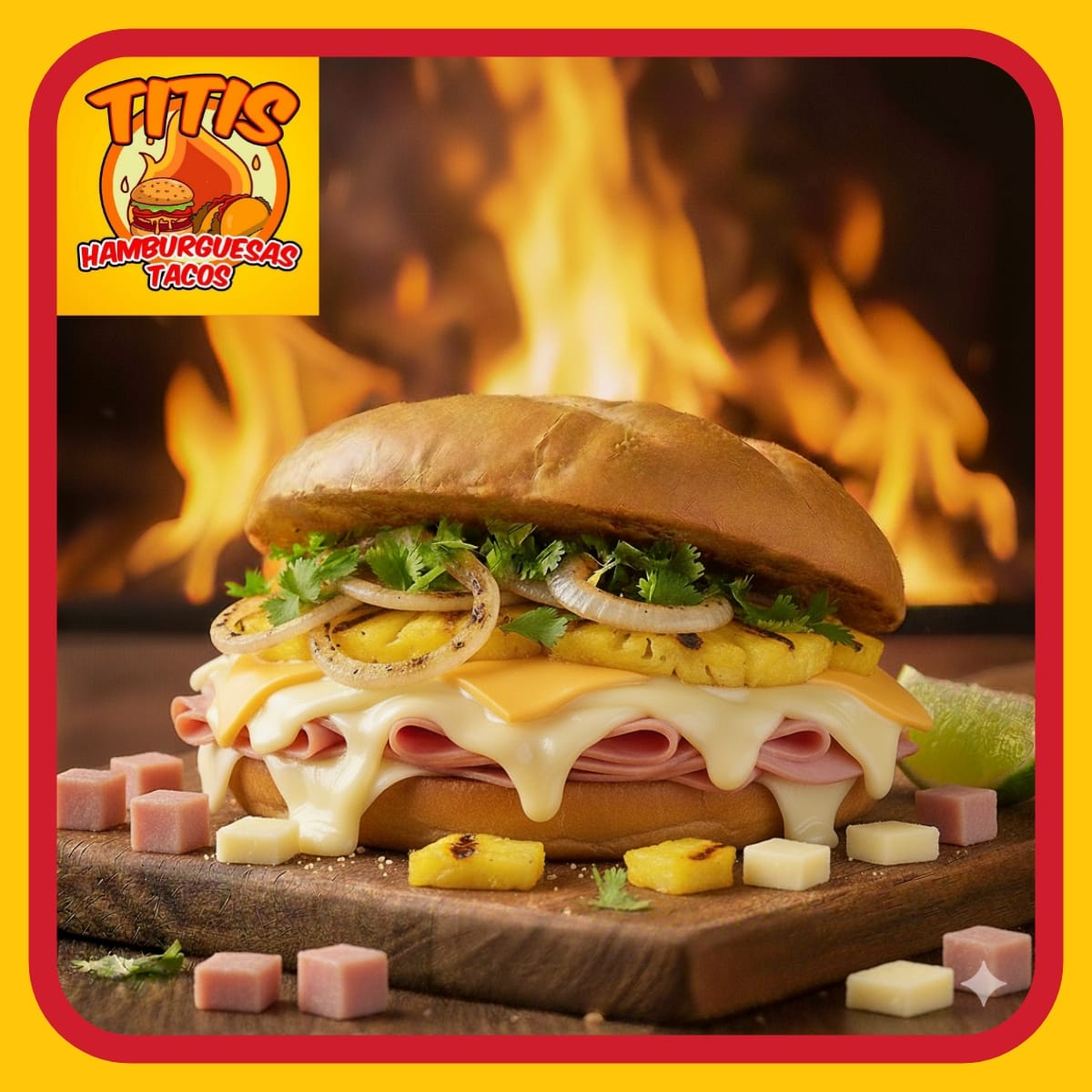 Bolillo , Jamon , Queso Amarilla , Queso Blanco Asadero , Piña , Cebolla Asada , Jitomate , Chiles Jalapeños , Lechuga , Crema , Mostaza y Chimichurri