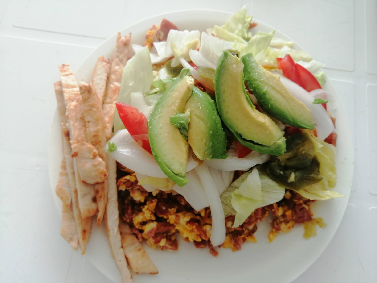 Chorizo, huevo, milanesa asada, verdura, aguacate y aderezos.