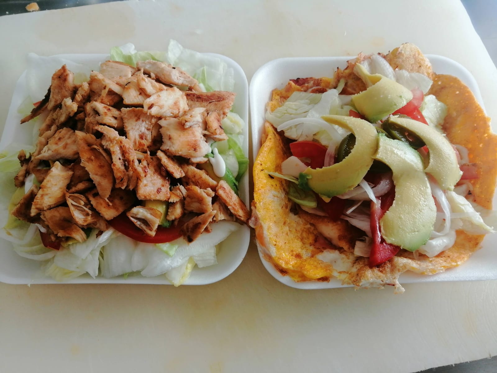 2 Huevos, jamón, queso asadero, verdura, aguacate y aderezos.