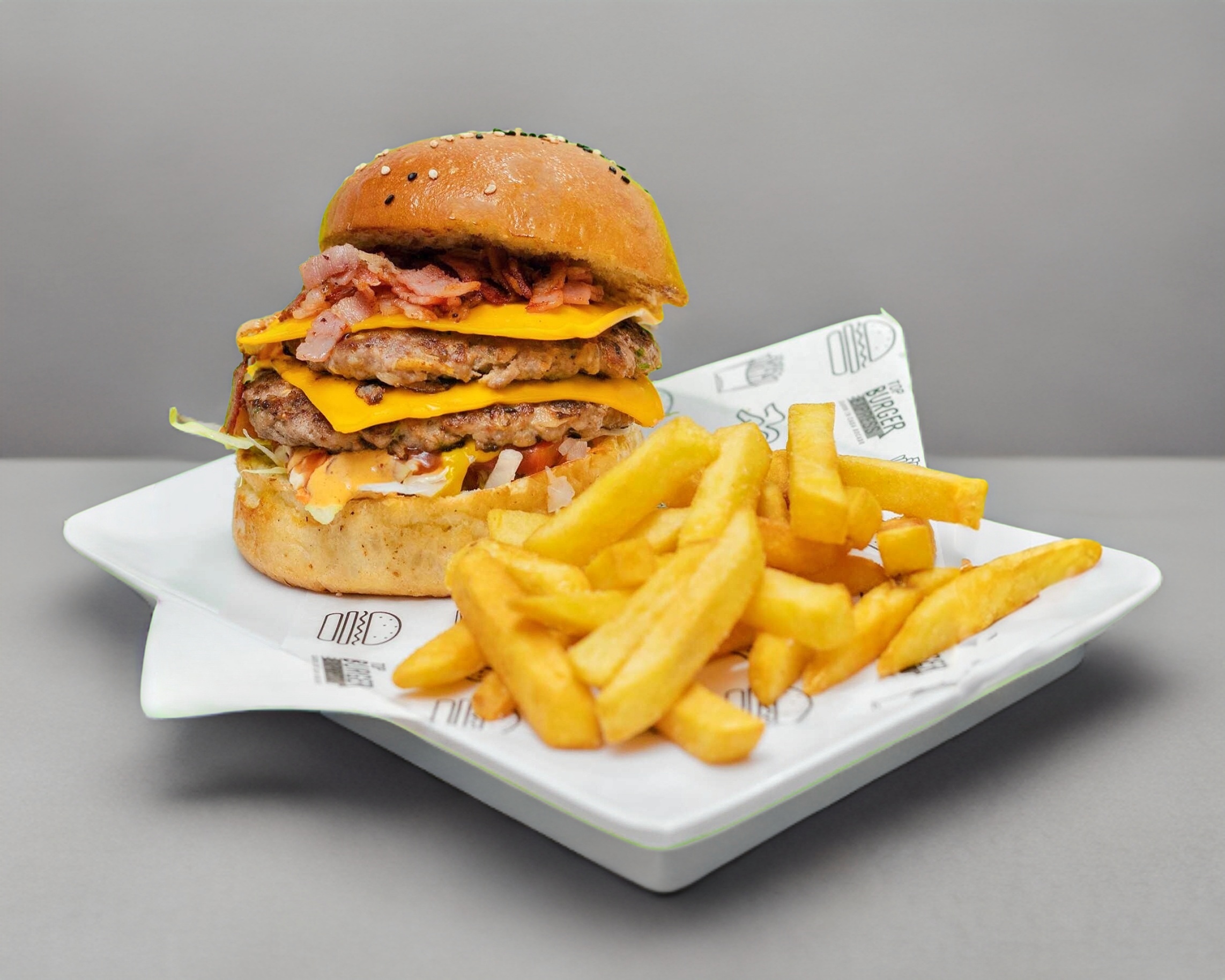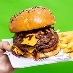 Doble carne, BBQ, queso amarillo, lechuga, jitomate, cebolla y mayonesa.