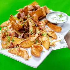 PAPA GAJO SAZONADA, MAYONESA CHIPOTLE, TOCINO CRUJIENTE, PARMESANO, PEREJIL Y ADEREZO RANCH.