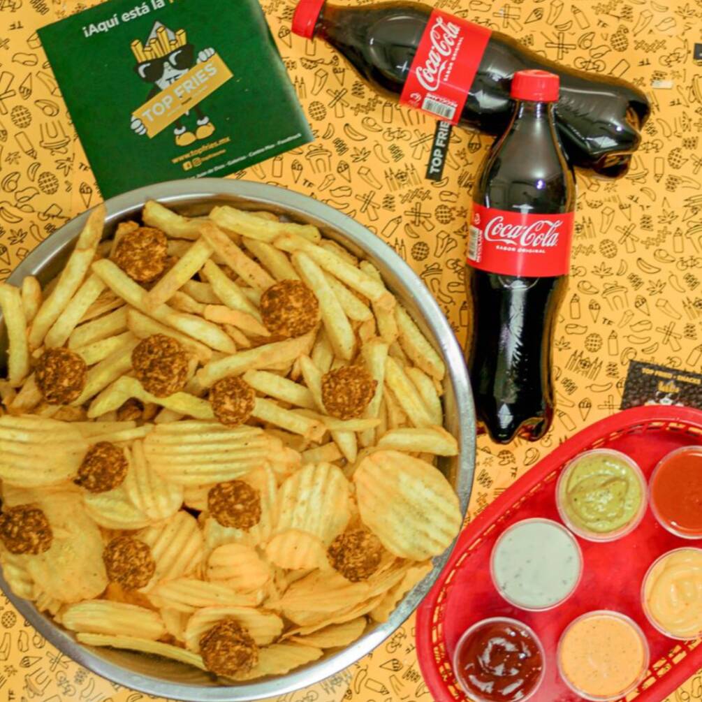 Top Pack #2 Incluye: 1 TOP BOX Corte francesa y Crunchip con TOP-PING de Tocino-Jalapeño Cheese Pops y 2 CocaColas 600ml