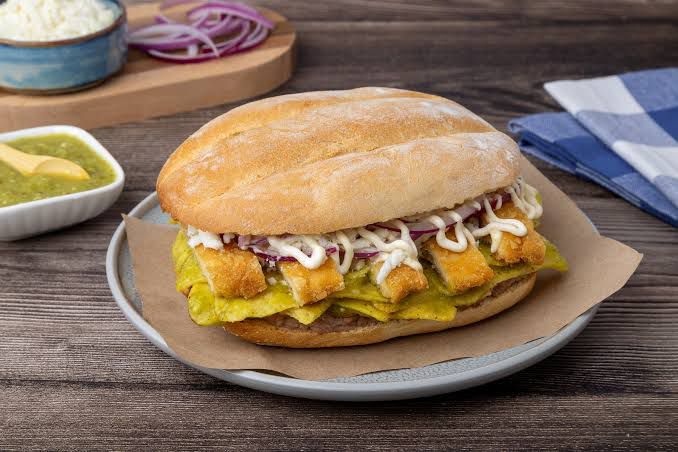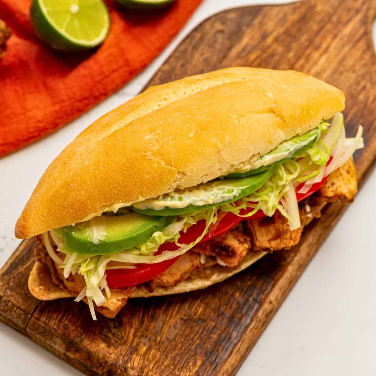 sandwich de pollo con lechuga, jitomate, aguacate, cebolla y jalapeños