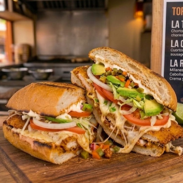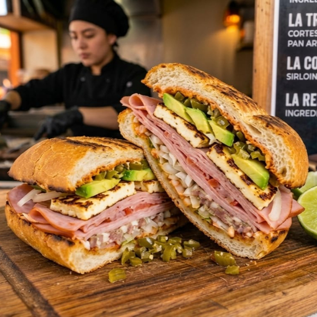 Deliciosa Torta especial con ingredientes : Chorizo, Jamon de Pierna Pimiento, Queso Panela a la Plancha, Aguacate, Jitomate, Cebolla Asada, Lechuga, Chiles en Vinagre, Salsa de la Casa