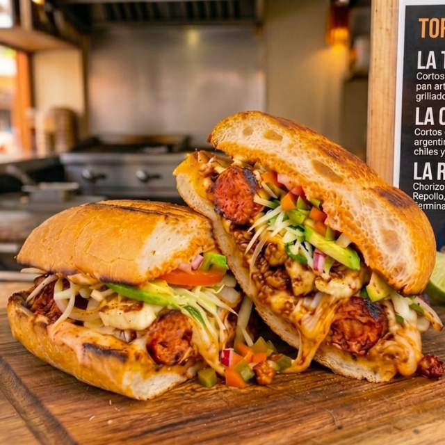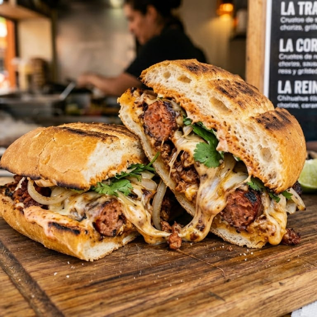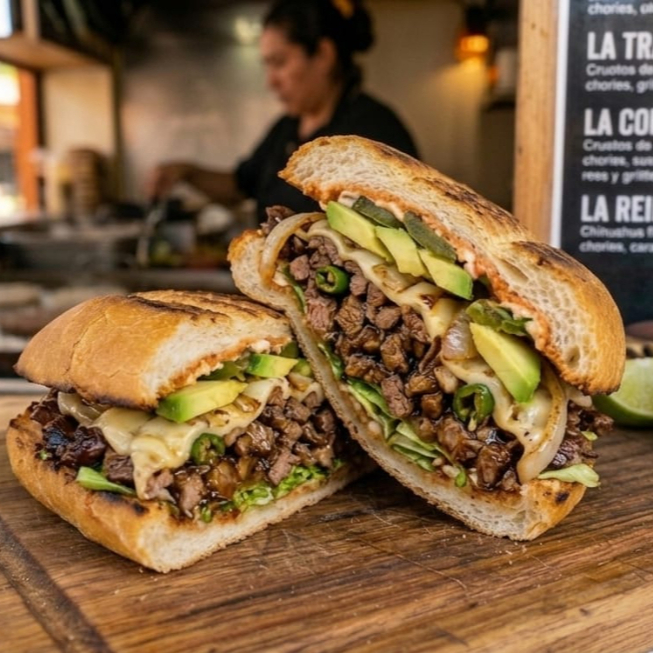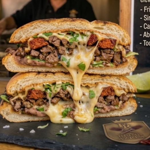 Deliciosa Torta especial con ingredientes : Carne Sirloin, Chorizo, Queso asadero Fundido, Cama de Frijoles,Cebolla Asada, Cilantro,Salsa Roja