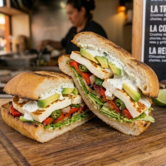 Deliciosa Torta especial con ingrdientes premium : Champiñones a la plancha, Aguacate, Queso Panela a la plancha, Chile Morron, Cebolla Asada, Jitomate, Lechuga, Chiles en Vinagre, Salsa Ranch,