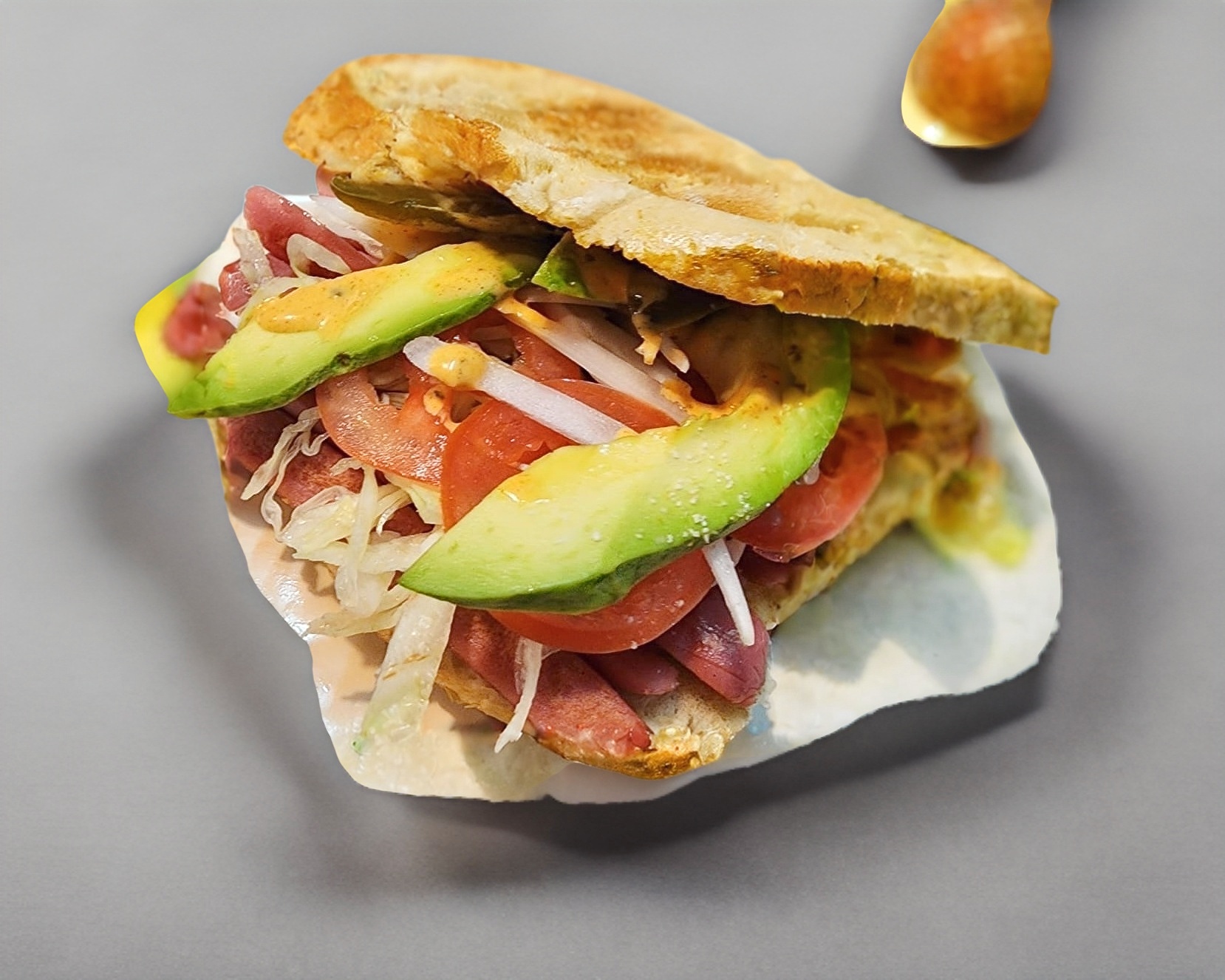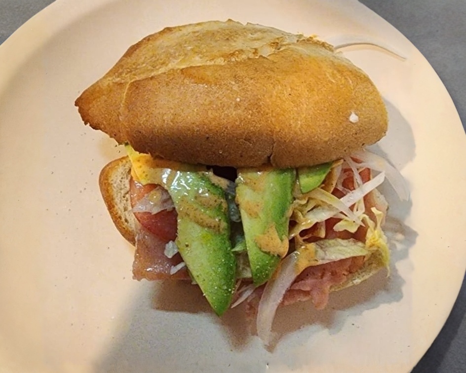 Aguacate, queso asadero, jitomate, lechuga, cebolla, chile jalapeño, mayonesa, mostaza y crema