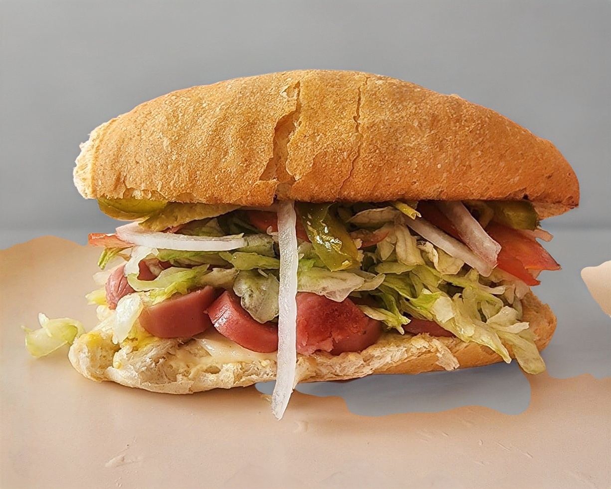 Chorizo de cerdo, queso asadero, jitomate, cebolla, lechuga, chile jalapeño, aguacate, mayonesa, crema, mostaza