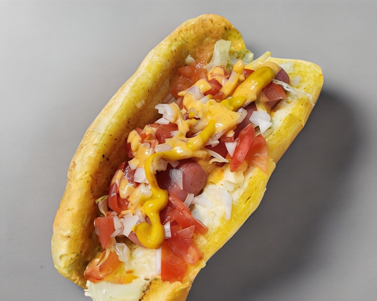Salchicha de pavo, queso asadero, jitomate, cebolla, chile, crema y mostaza.