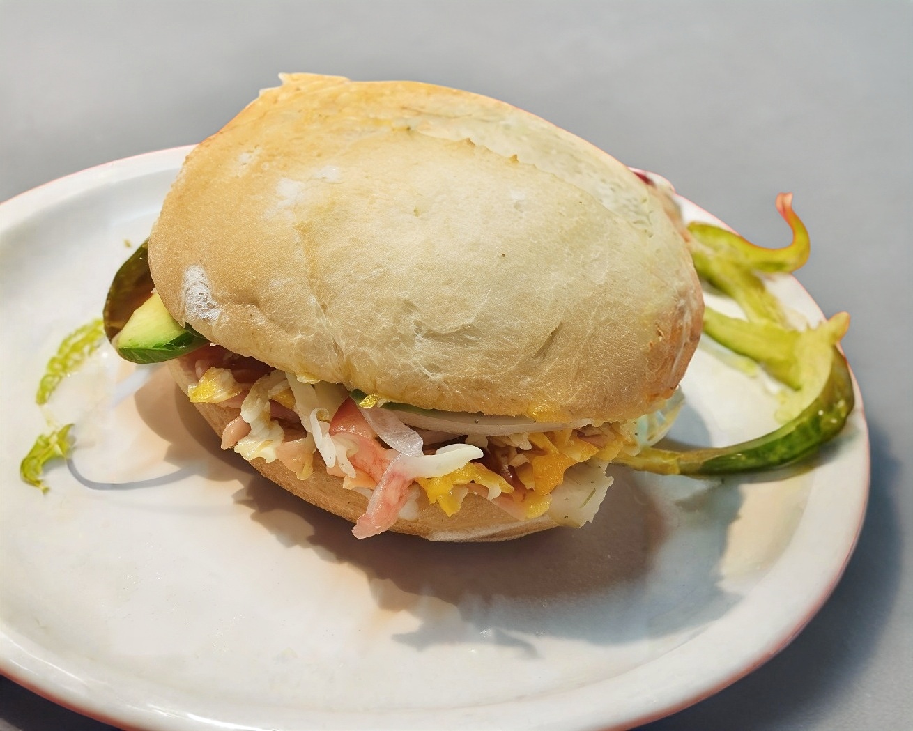 Pierna, jamón, queso amarillo, queso asadero, chile, jitomate, cebolla, aguacate, mostaza, crema.