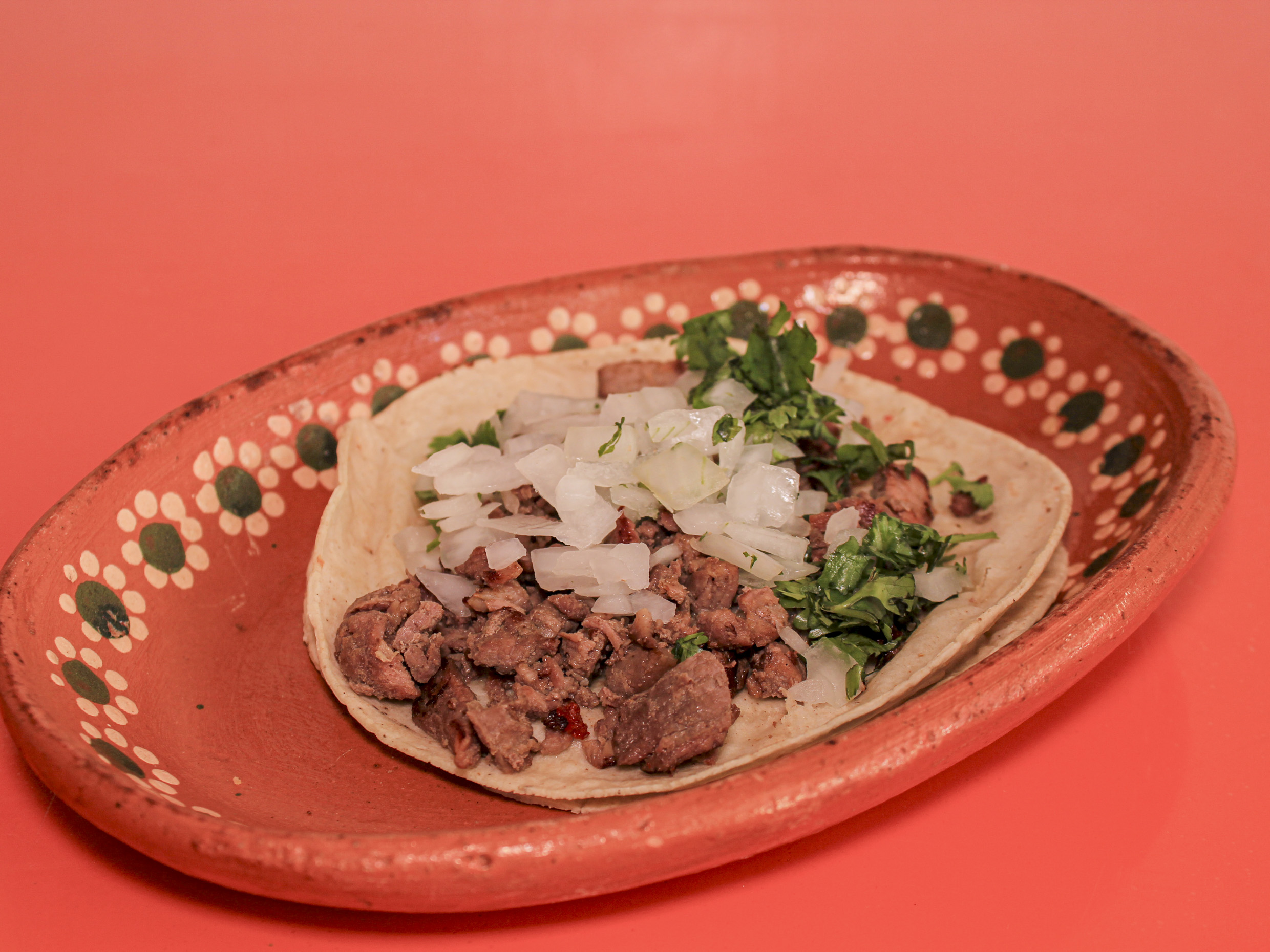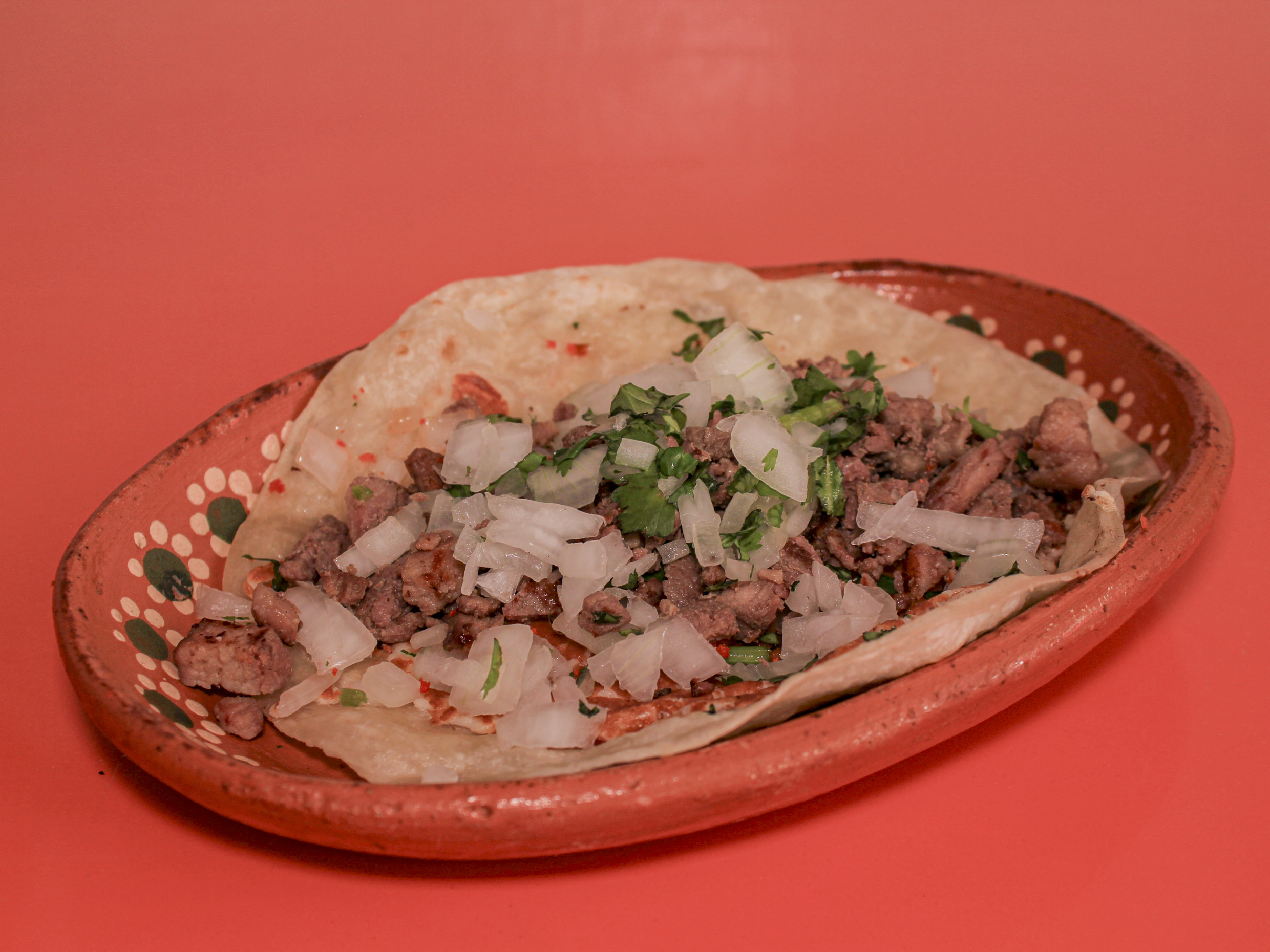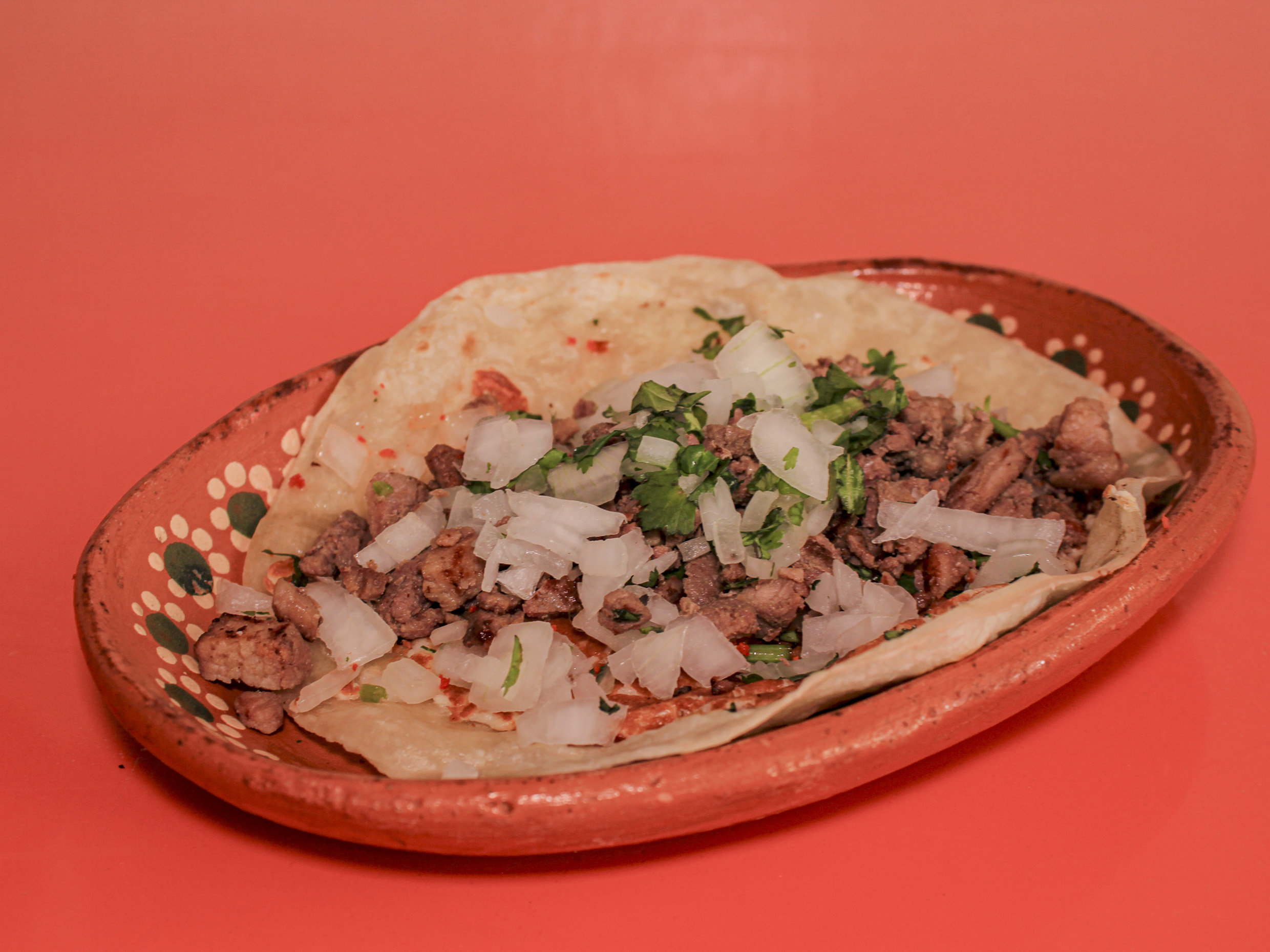 Tortilla de maíz con cebolla cilantro salsa roja cebolla asada y chile asado