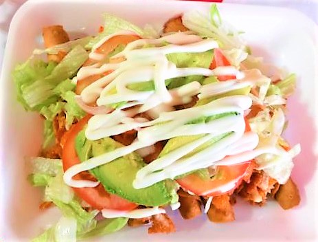 Deliciosa ensalada de pollo con complementos y aderezo a elegir