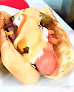 Delicioso hot dog, con salchicha, , verdura y aderezos