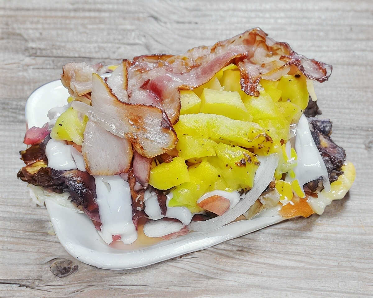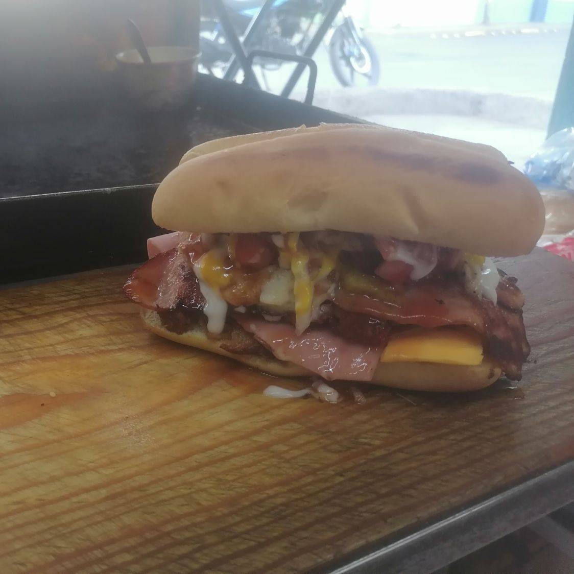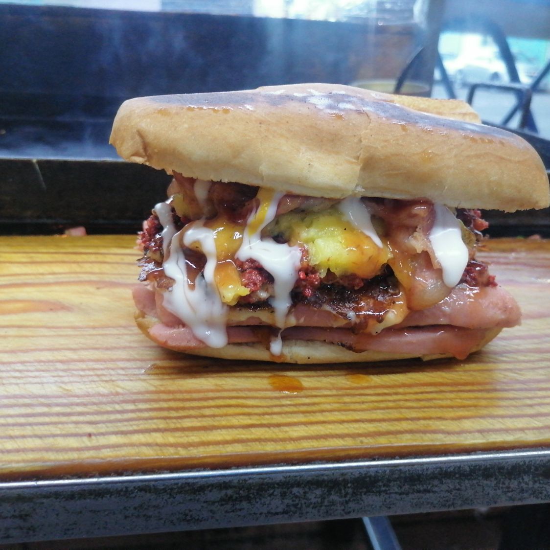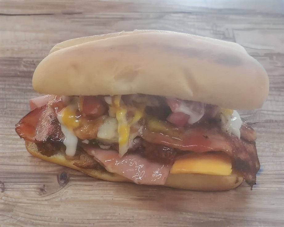 Carne de hamburguesa queso blanco queso amarillo jamón tocino, acompañada de lechuga jitomate cebolla jalapeño crema capsu y mostaza