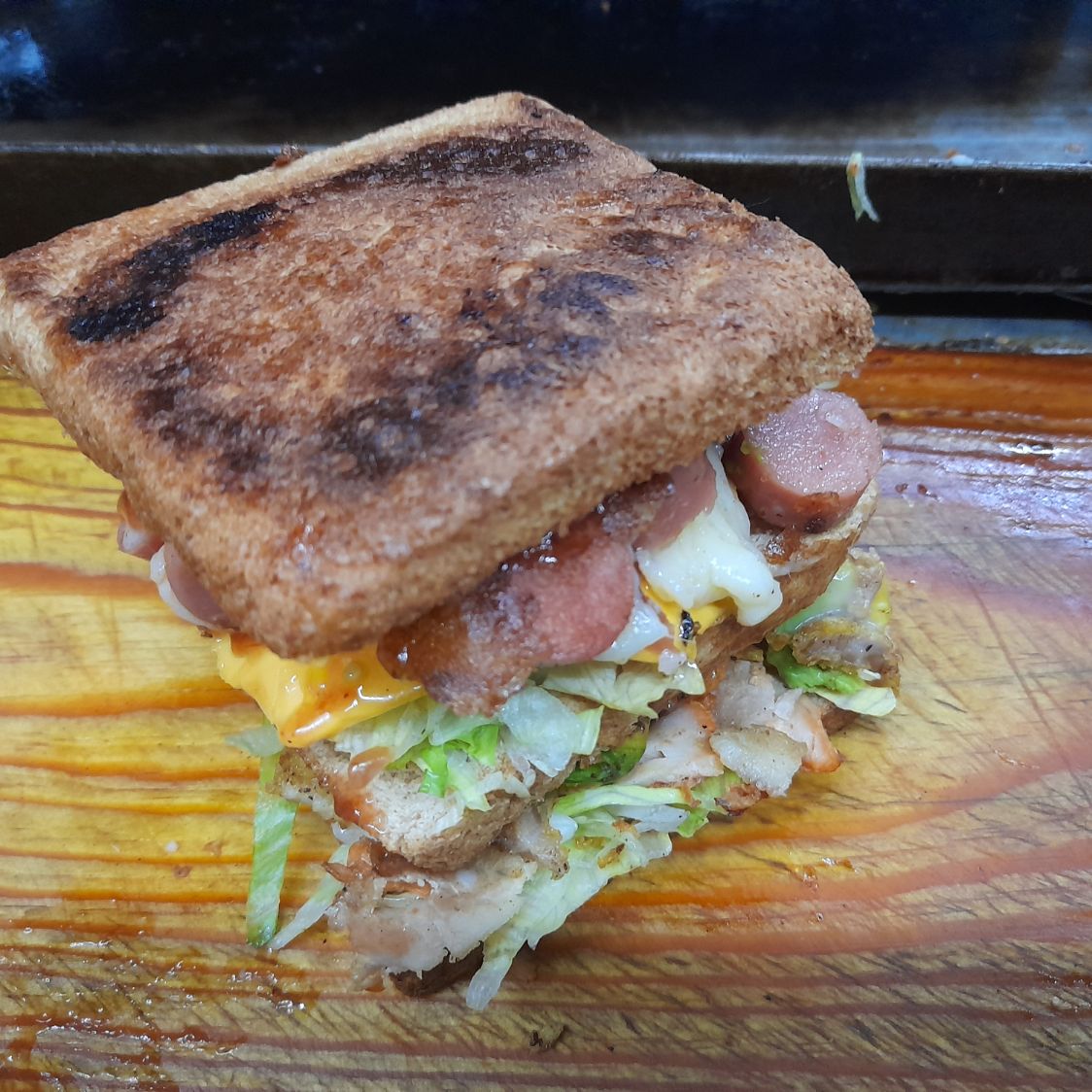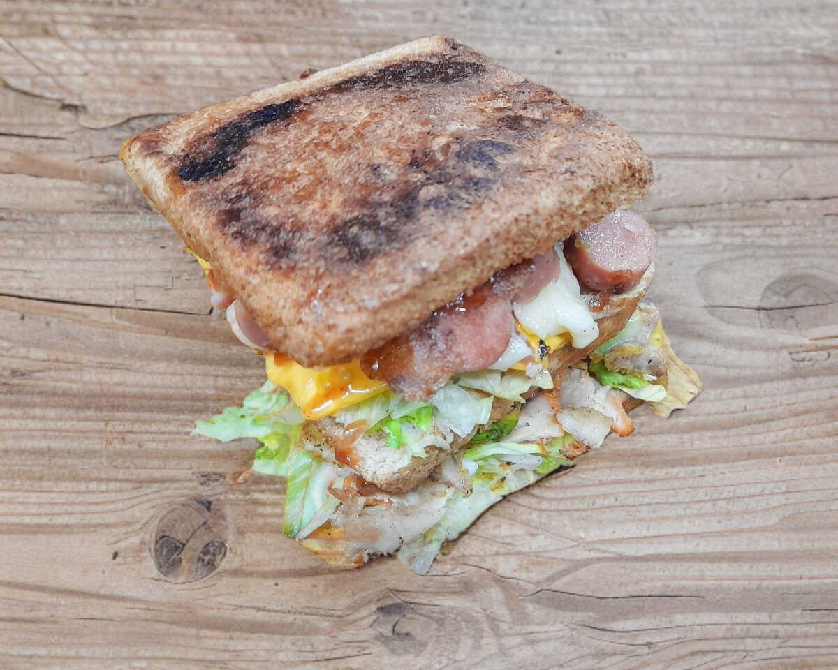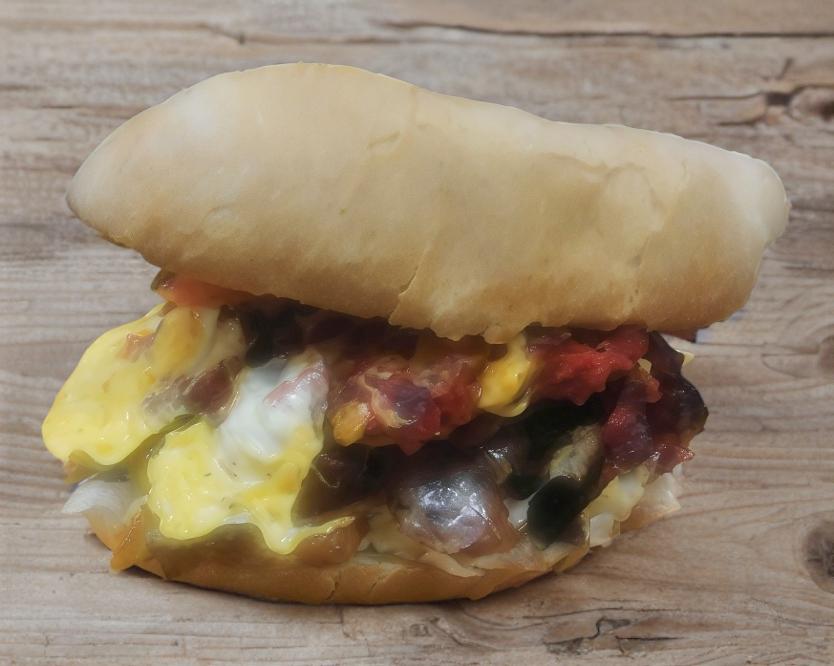 Sándwich caliente a la plancha con jamón con queso asadero y amarillo, jitomate, cebolla, jalapeño crema, mayonesa, aguacte