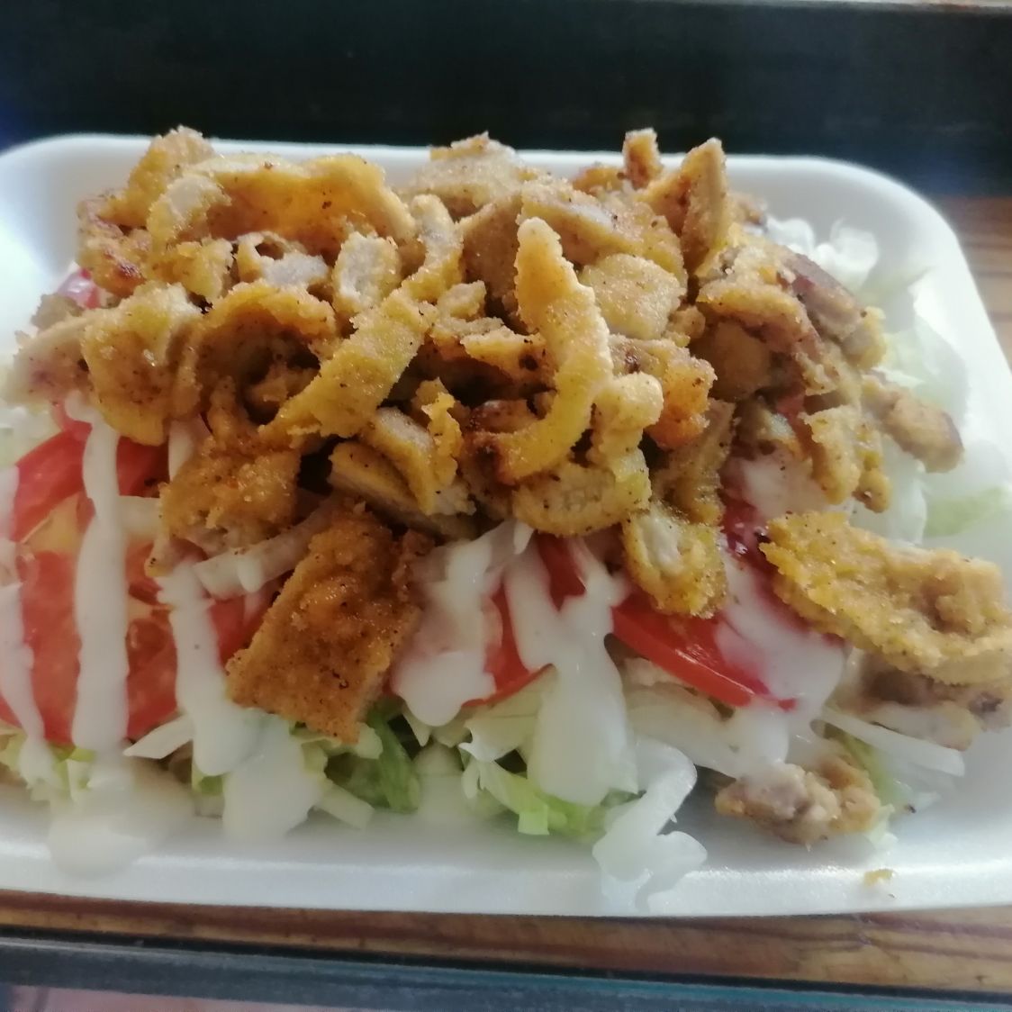 Salchicha a la plancha, lechuga, jitomate, cebolla, jalapeños crema salsa de tomate moztasa