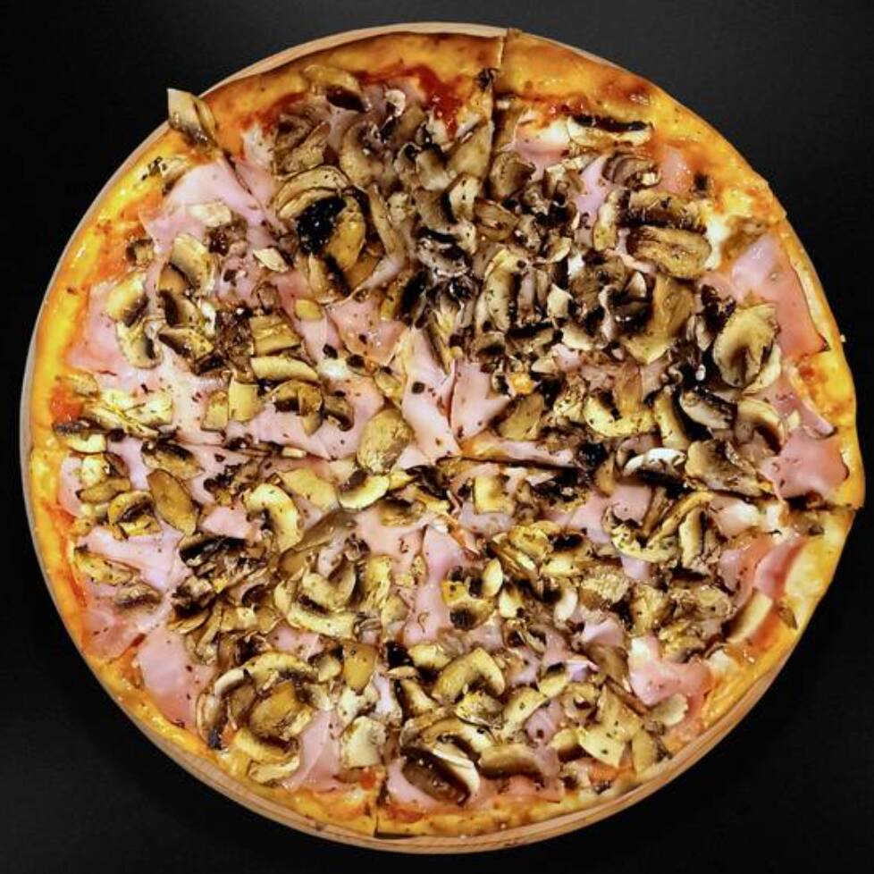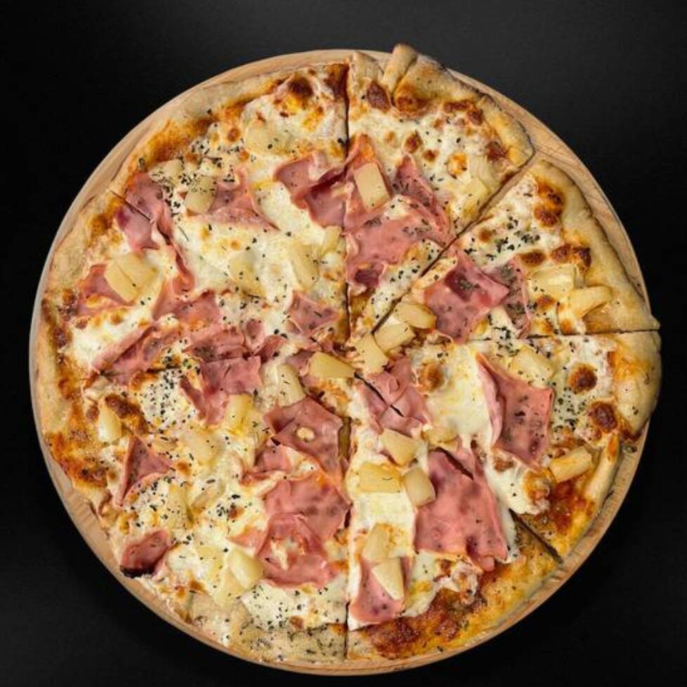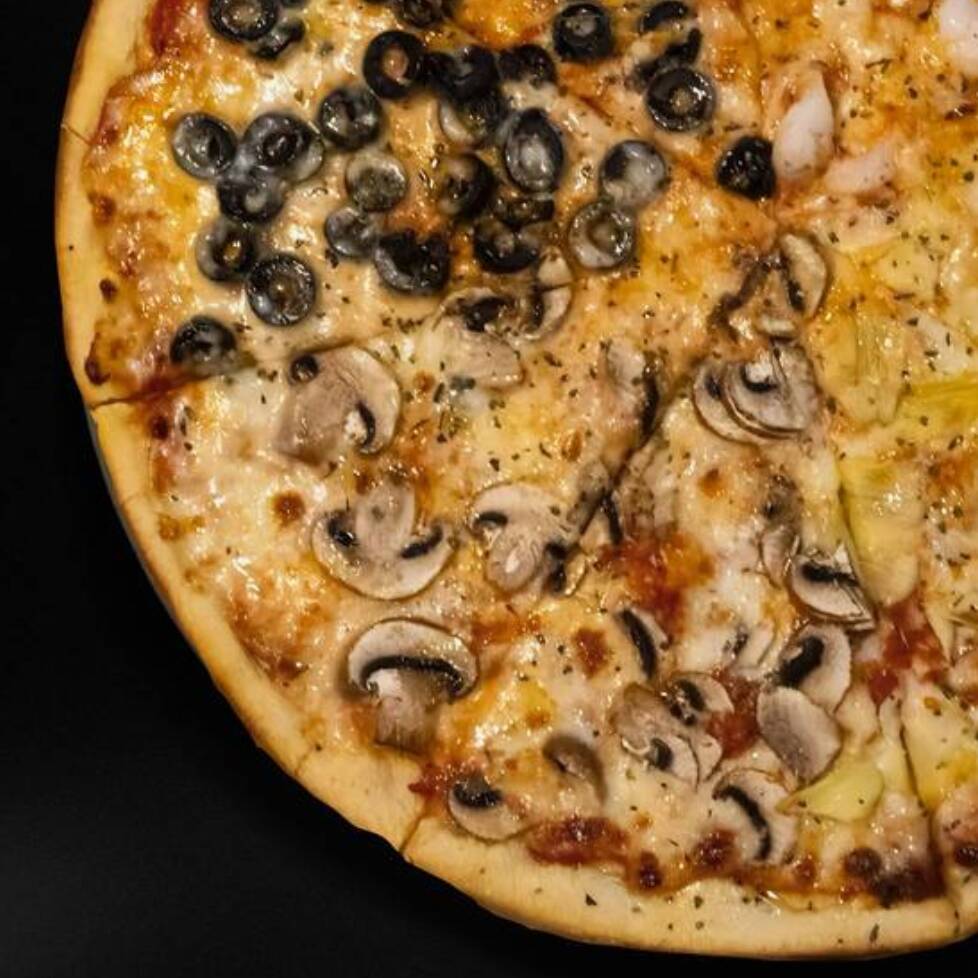 Jamón cocido, pepperoni, chorizo, champiñón, pimiento, piña, aceitunas negras y mozzarellas.